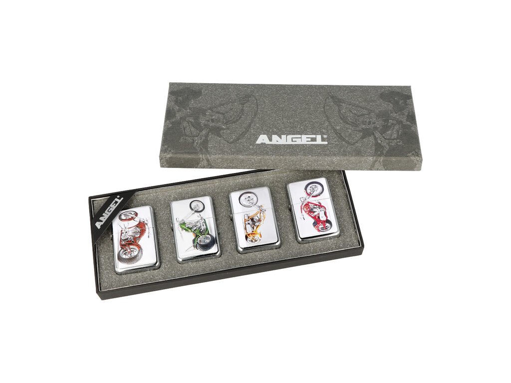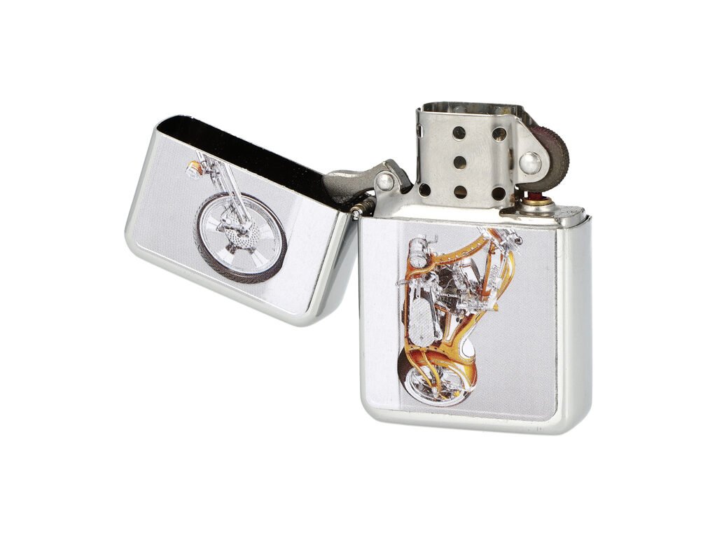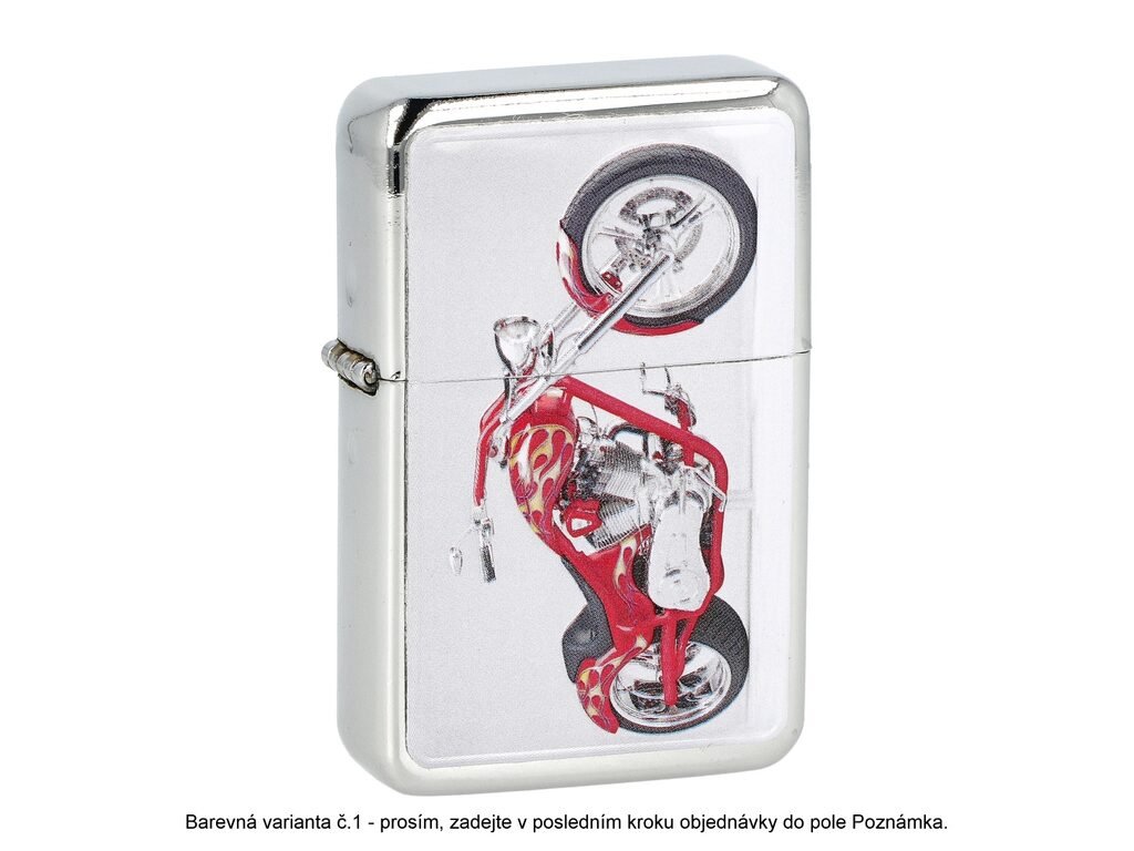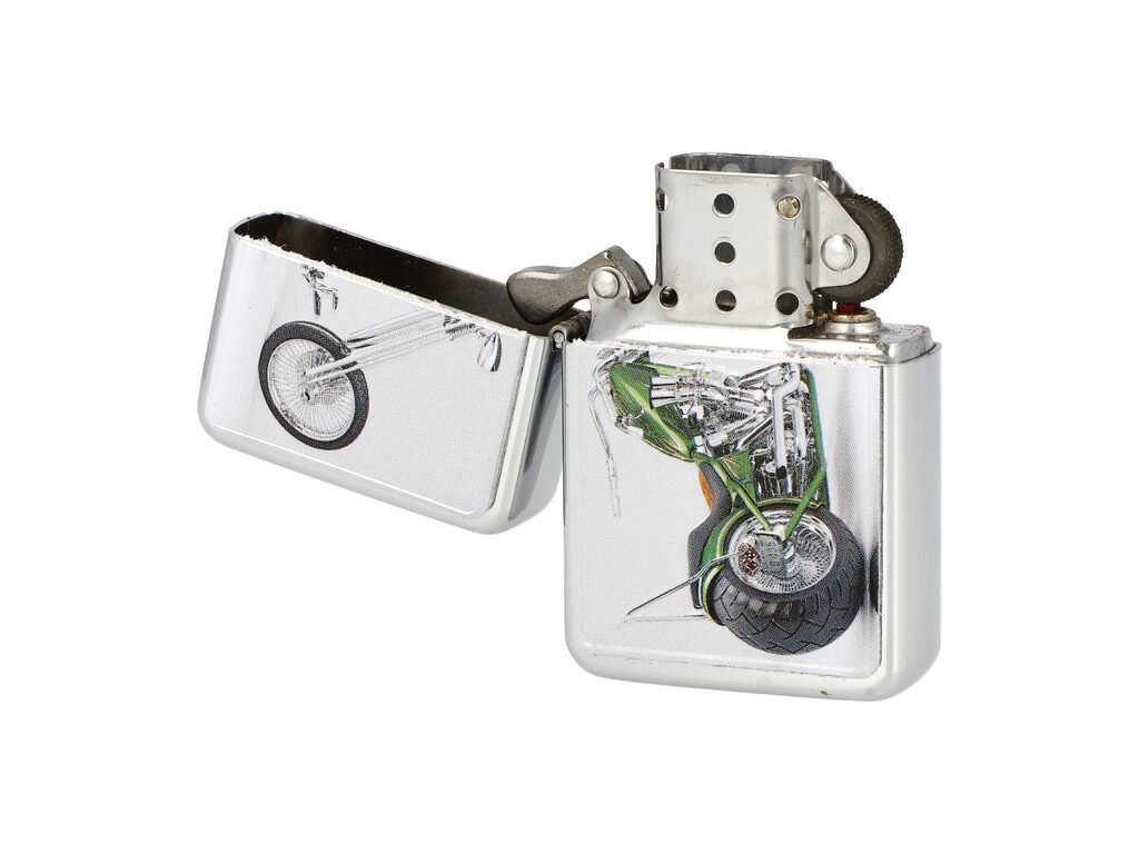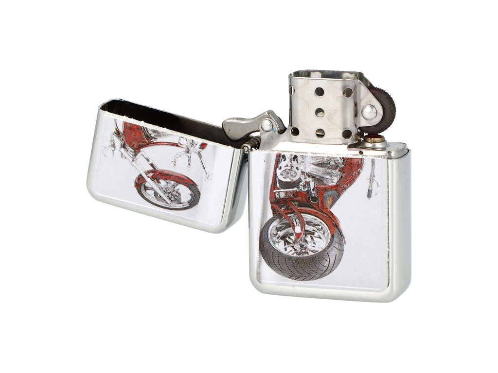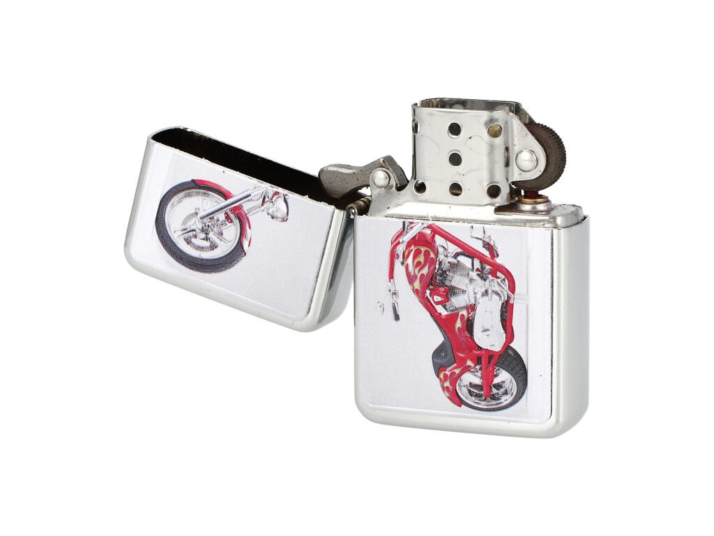 Benzínový zapalovač Z 16 Angel Motorbikes. Zapalovač v chromovém lesklém provedení je na čelní straně zdobený plastickým motivem s motorkami. Zadní strana je hladká. Benzínový zapalovač je dodáván bez náplně. Cena je uvedena za 1 ks. Před odesláním objednávky uveďte číslo barevného provedení do poznámky.