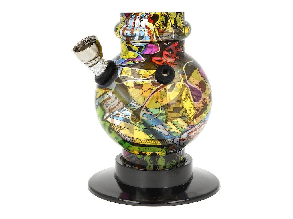 Akrylový bong Graffiti je transparentní bong s barevným potištěným povrchem atraktivním motivem Graffiti. Rovný akrylový bong je vyrobený z tvrzeného plastu tloušťky 2 mm. Ve spodní části najdeme otvor pro turbo.