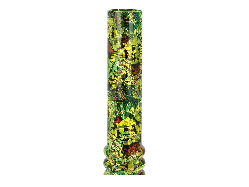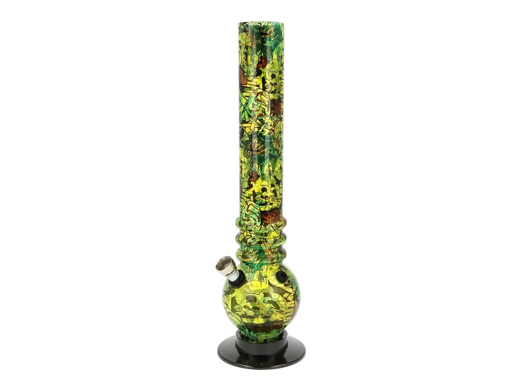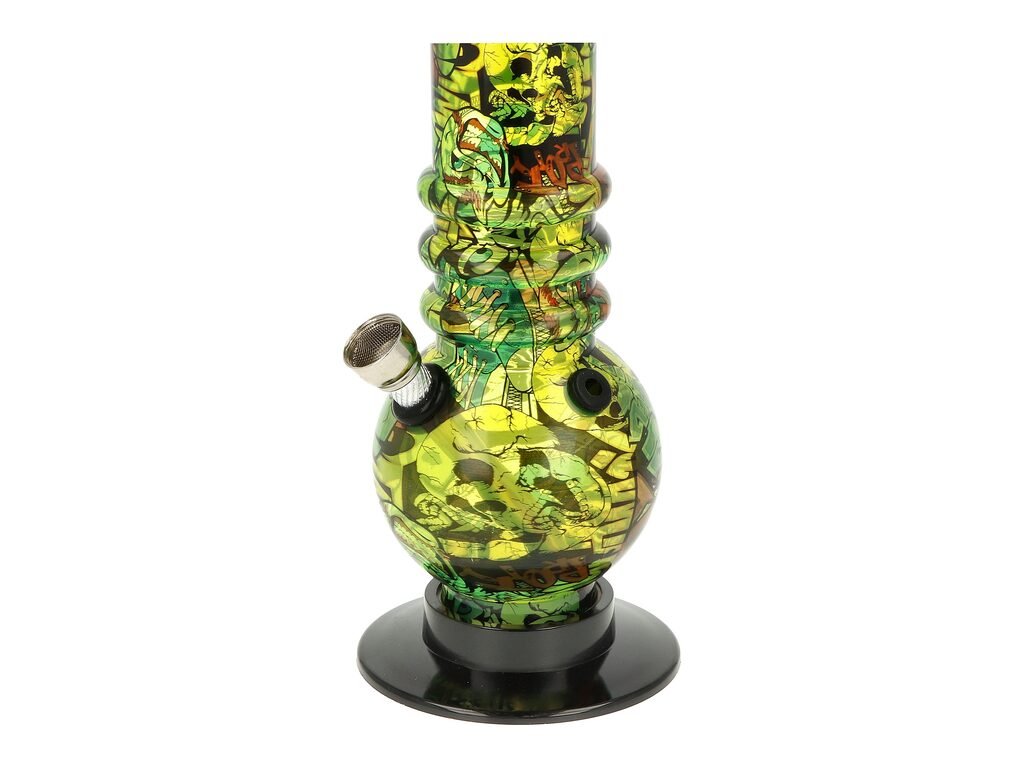Akrylový bong Graffiti je transparentní bong ve žlutém tónu má povrch barevně potištěný motivem Graffiti. Rovný akrylový bong je vyrobený z tvrzeného plastu tloušťky 2 mm. Ve spodní části najdeme otvor pro turbo.