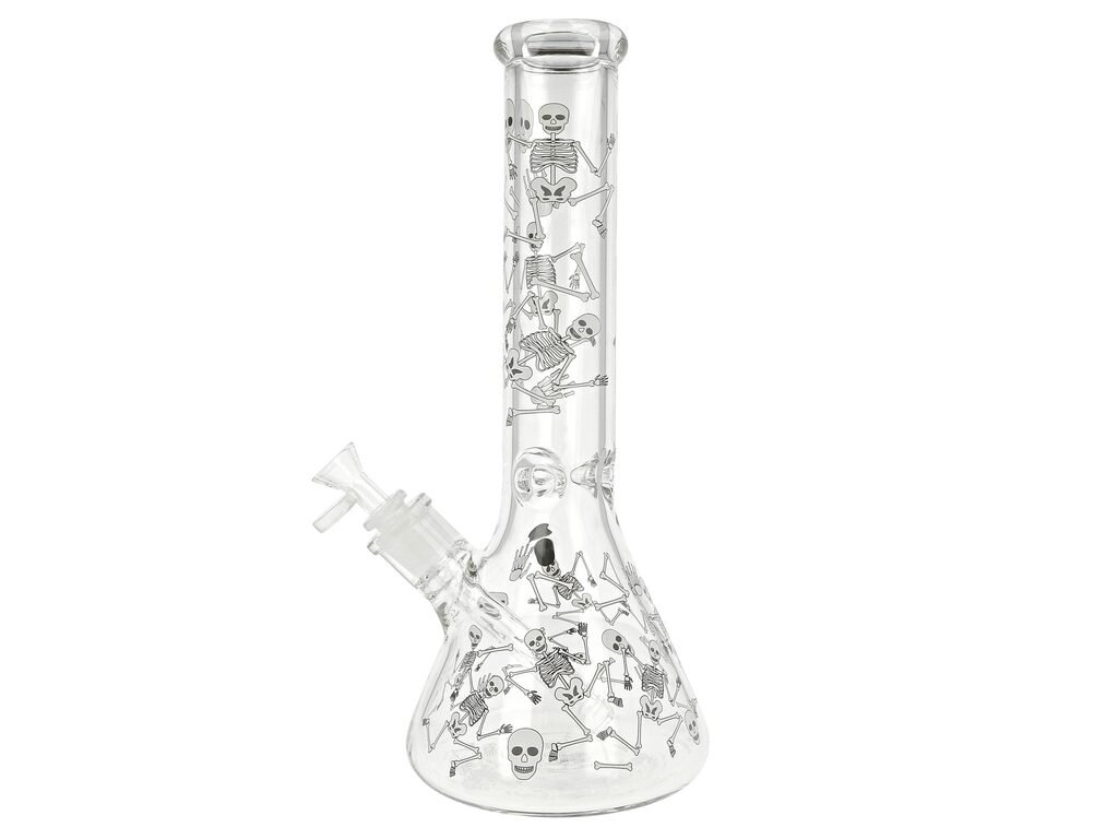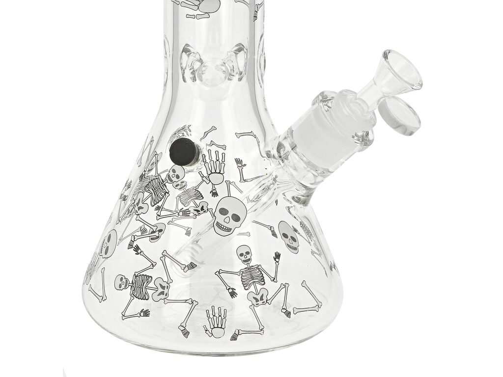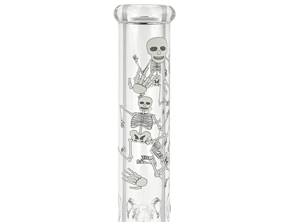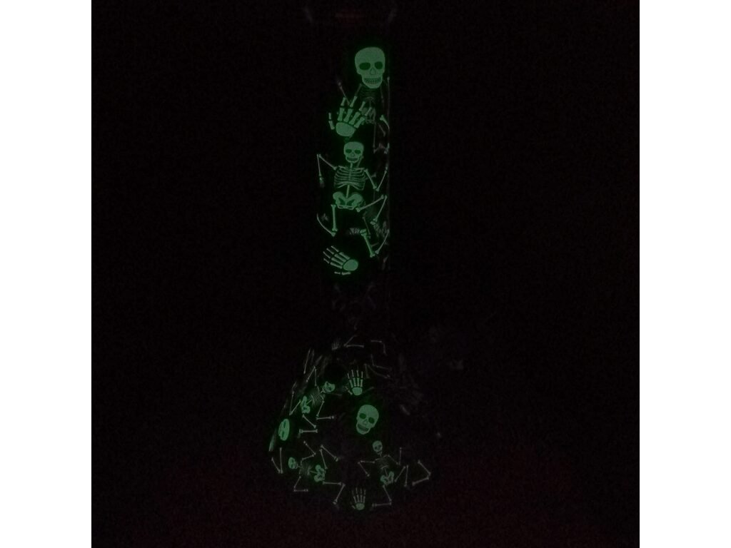 Skleněný bong Super Heroes Beaker Skulls s Glow efektem. Transparentní bong tvaru laboratorní kádinky je zdobený černobílými kostlivci, které díky efektu Glow in the Dark bong ve tmě rozzáří. Ice bong ukončený silným hrdlem je vybavený "výstupky" pro udržení kostek ledu k ochlazení kouře. Oproti standardním bongům je tento prémiový bong vyrobený z tepelně odolného borosilikátového skla tloušťky 7 mm. Ve spodní části najdeme otvor pro turbo s gumovou záslepkou. Dvoudílný chillum bongu s difuzérem se šesti zářezy, který pomáhá zjemnit a ochladit kouř již na začátku, je ukončený samostatným kotlíkem s praktickým držátkem a větším otvorem (cca 7 mm).