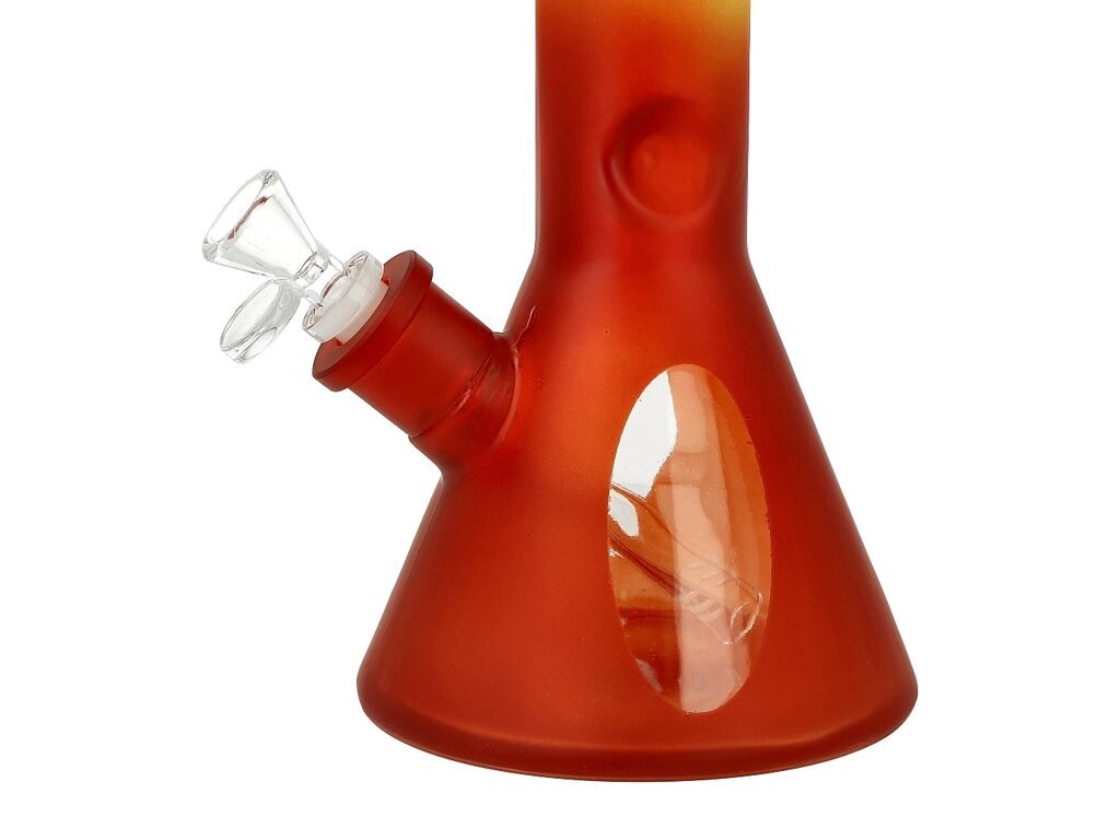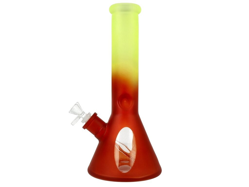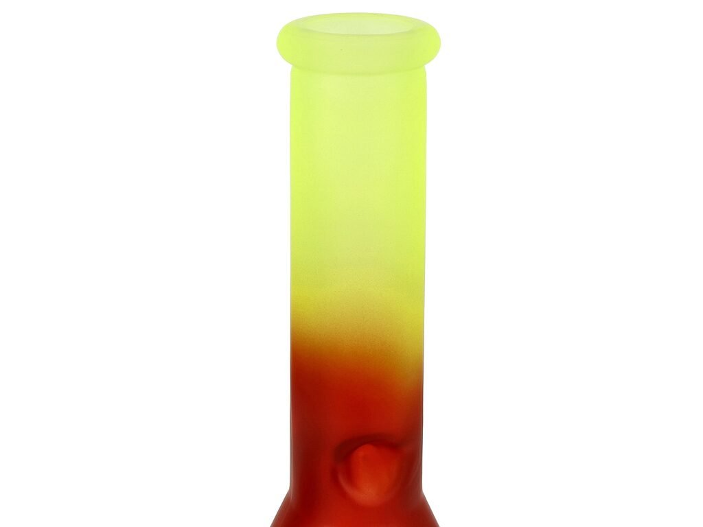 Skleněný bong Super Heroes Ice colored Red. Rovný bong tvaru laboratorní baňky je v červeno žlutém barevném provedení s matným povrchem. Pro ochlazení kouře je ice bong vybavený "výstupky", které udrží kosteky ledu. Oproti standardním bongům je tento prémiový bong vyrobený z tepelně odolného borosilikátového skla tloušťky 5 mm. Dvoudílný chillum bongu s difuzérem, který kouř ještě více zjemní, je ukončený samostatným kotlíkem. Kotlík s praktickým držátkem má menší otvor cca 4 mm.