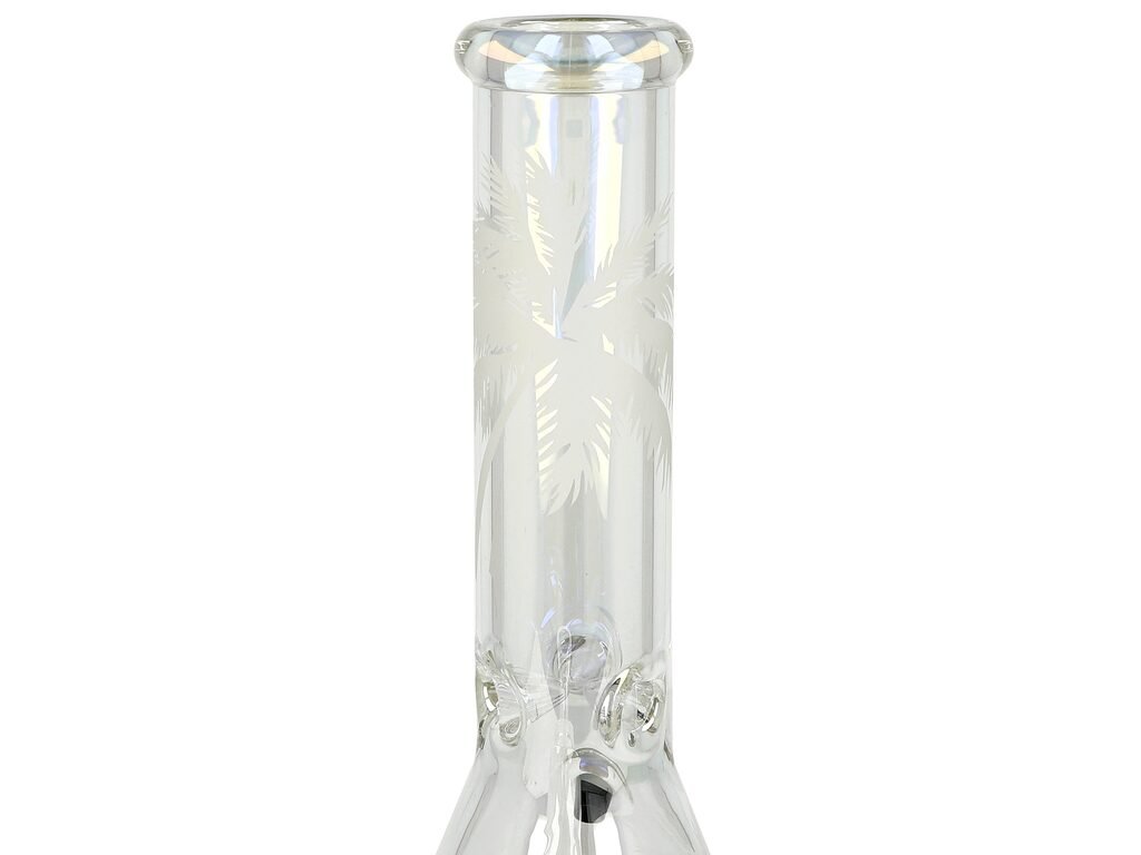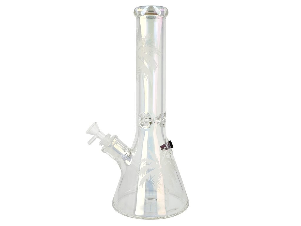 Atraktivní skleněný bong Super Heroes Ice Palm. Transparentní bong typu Beaker v lesklém perleťovém provedení je zdobený matným motivem palmy. Ice bong ukončený silným hrdlem je vybavený "výstupky" pro udržení kostek ledu k ochlazení kouře. Ve spodní části bongu najdeme otvor pro turbo se záslepkou. Oproti standardním bongům je tento prémiový bong vyrobený z tepelně odolného borosilikátového skla tloušťky 7 mm. Dvoudílný chillum bongu s difuzérem, který kouř rozděluje a zjemňuje, je vybavený samostatným kotlíkem. Kotlík s praktickým držátkem má menší otvor cca 7 mm.