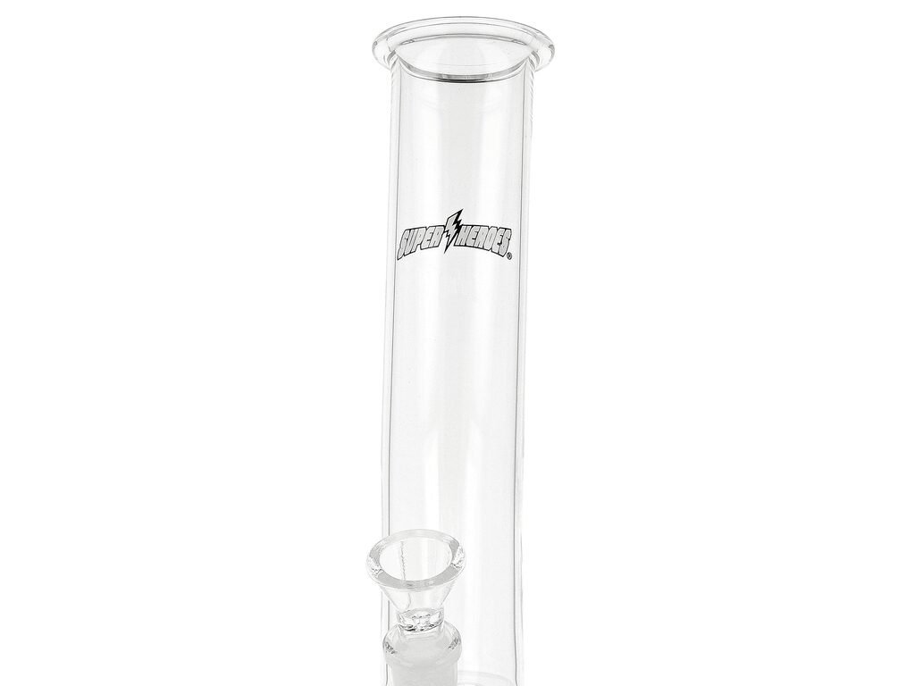 Skleněný bong Super Heroes Transparent Globe je zahnutý bong ve tvaru baňky, který je na čelní straně zdobený bílým logem Super Heroes.