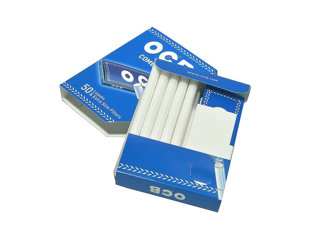 Cigaretové filtry OCB Extra Slim+papírky OCB Blue. Knížečka obsahuje 50 ks papírků. Prodej pouze po celém balení (displej) 20 ks.