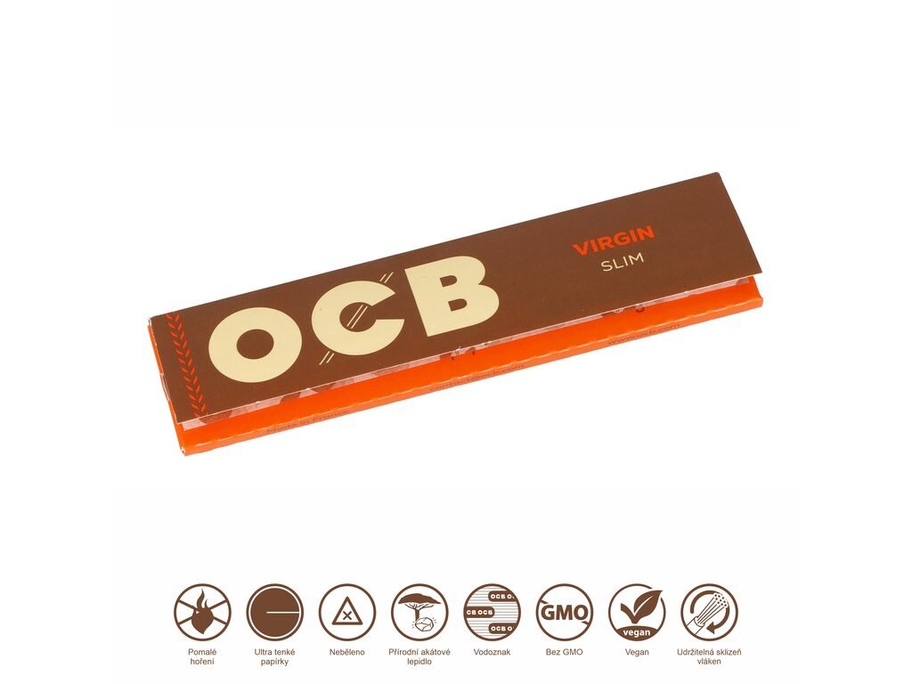 Cigaretové papírky OCB Slim VIRGIN. Ultratenký nebělený papír. Knížečka 32 papírků. Prodej pouze po celém balení (displej) 50 ks.