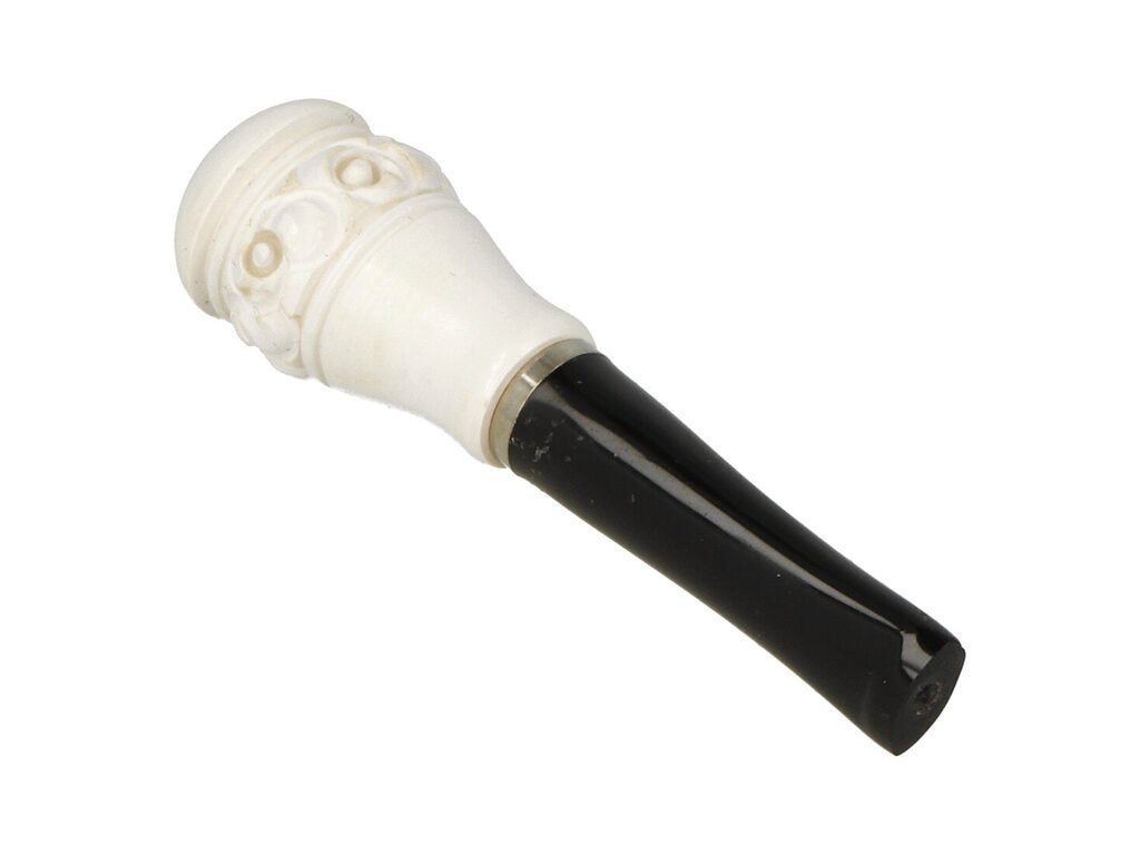 Krátká cigaretová meršánová špička Meerschaum bez filtru je špička na cigaretu od předního tureckého výrobce produkující cigaretové špičky a dýmky z mořské pěny (Meerschaum). Špička ručně vyrobená z tureckého meršánu je vybavená barevným lesklým náustkem z akrylátu. Hladký lesklý povrch v přírodním odstínu je bohatě zdobený řezaným motivem.