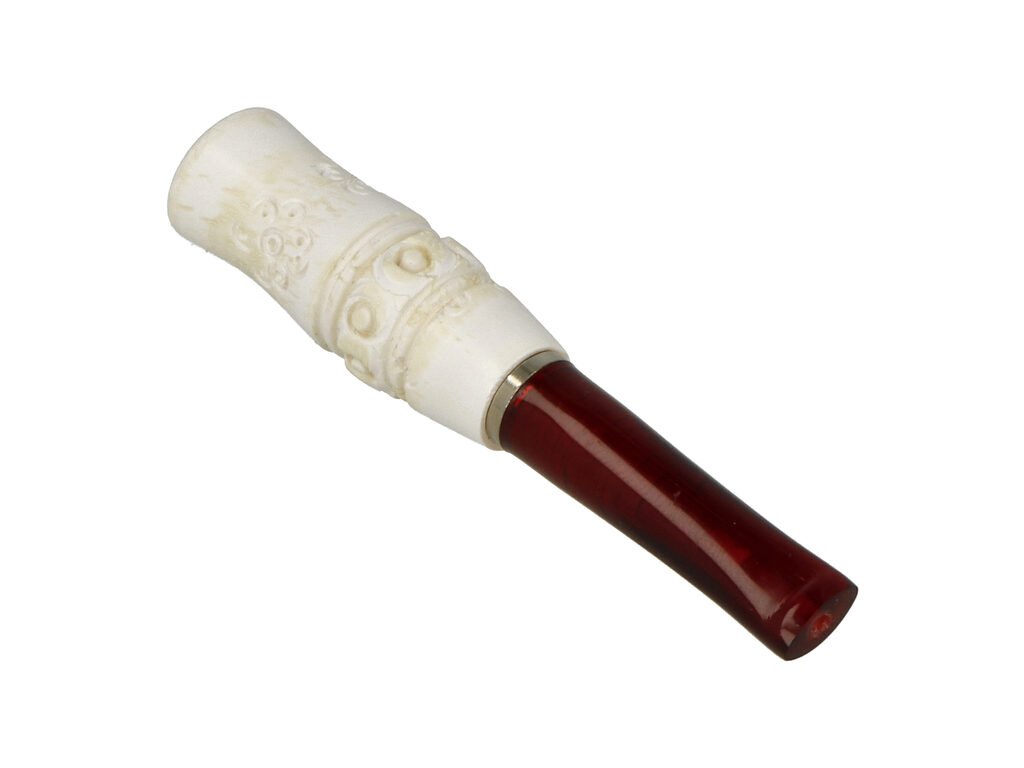 Krátká cigaretová špička Meerschaum bez filtru. Špičky na cigaretu Meerschaum od předního tureckého výrobce produkující nejen cigaretové špičky, ale především kvalitní dýmky z mořské pěny (dýmky Meerschaum). Ručně vyrobená špička z tureckého Meerschaumu je vybavená lesklým náustkem z akrylátu. Hladký lesklý povrch v přírodním odstínu je bohatě zdobený řezaným motivem. Meerschaum je organický nerost (minerál sepiolit, nazývaný též afrodit), který je porézní a plave ve vodě. Špičky z Meerschaumu poskytují kuřákovi požitek z chladného a chutného kouře. Díky poréznosti materiálu navíc absorbují část vlhka a tabákového dehtu, který vzniká při kouření tabáku. Tyto špičky zaujmou svojí bílou barvou, která se po kouření postupně mění na krásné odstíny žluté, červené později zlatohnědé. Cigaretová špička z mořské pěny je dodávaná koženkovém pouzdru.