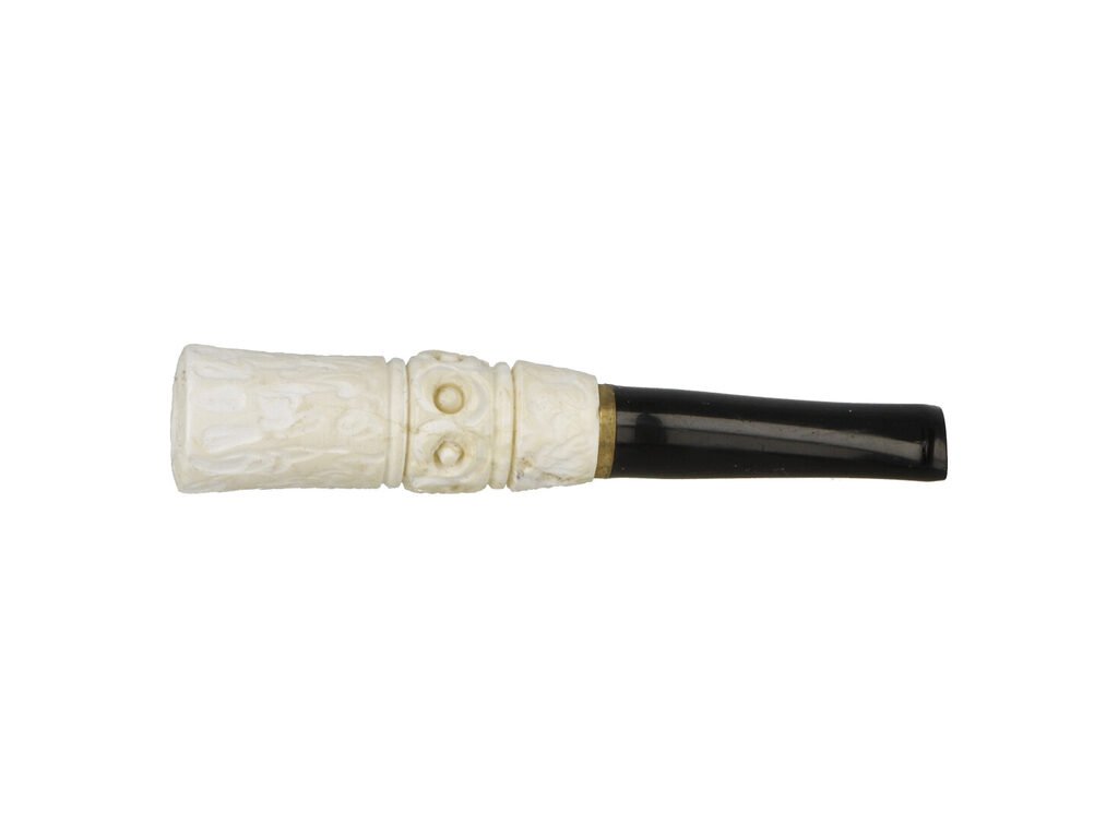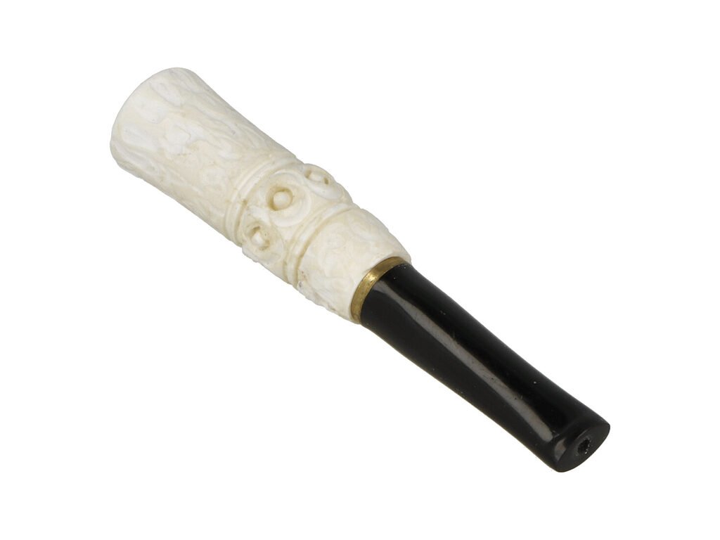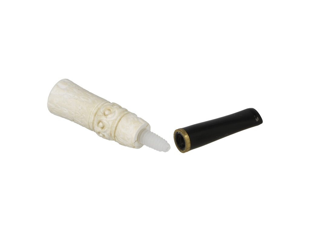 Krátká cigaretová špička Meerschaum bez filtru. Špičky na cigaretu Meerschaum od předního tureckého výrobce produkující nejen cigaretové špičky, ale především kvalitní dýmky z mořské pěny (dýmky Meerschaum). Ručně vyrobená špička z tureckého Meerschaumu je vybavená černým lesklým náustkem z akrylátu. Hladký lesklý povrch v přírodním odstínu je bohatě zdobený řezaným motivem. Meerschaum je organický nerost (minerál sepiolit, nazývaný též afrodit), který je porézní a plave ve vodě. Špičky z Meerschaumu poskytují kuřákovi požitek z chladného a chutného kouře. Díky poréznosti materiálu navíc absorbují část vlhka a tabákového dehtu, který vzniká při kouření tabáku. Tyto špičky zaujmou svojí bílou barvou, která se po kouření postupně mění na krásné odstíny žluté, červené později zlatohnědé. Cigaretová špička z mořské pěny je dodávaná koženkovém pouzdru.