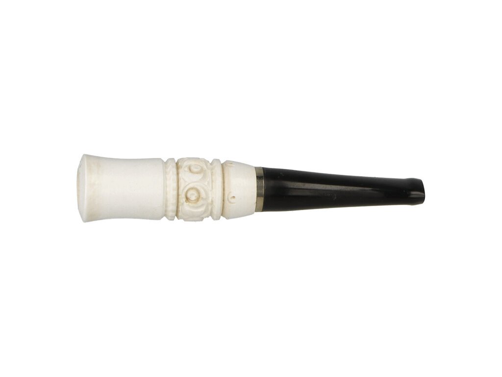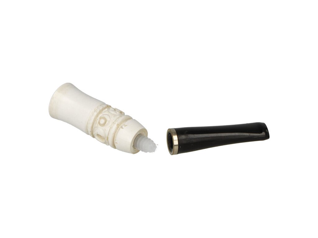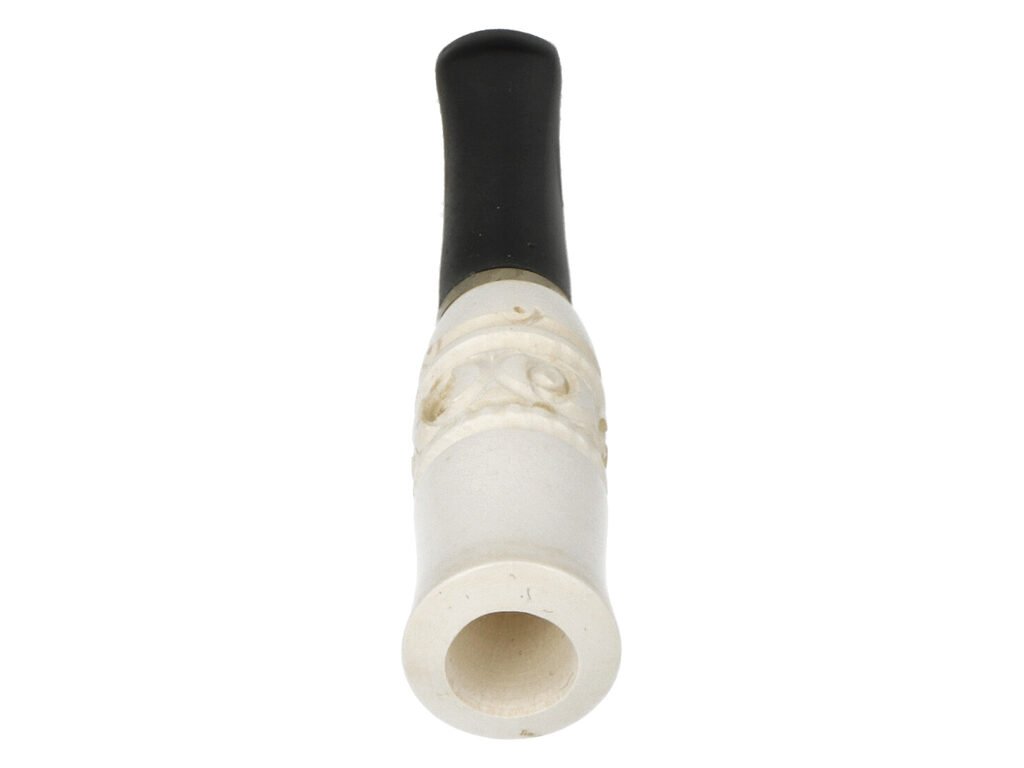 Krátká cigaretová špička Meerschaum bez filtru. Špičky na cigaretu Meerschaum od předního tureckého výrobce produkující nejen cigaretové špičky, ale především kvalitní dýmky z mořské pěny (dýmky Meerschaum). Ručně vyrobená špička z tureckého Meerschaumu je vybavená černým lesklým náustkem z akrylátu. Hladký lesklý povrch v přírodním odstínu je bohatě zdobený řezaným motivem. Meerschaum je organický nerost (minerál sepiolit, nazývaný též afrodit), který je porézní a plave ve vodě. Špičky z Meerschaumu poskytují kuřákovi požitek z chladného a chutného kouře. Díky poréznosti materiálu navíc absorbují část vlhka a tabákového dehtu, který vzniká při kouření tabáku. Tyto špičky zaujmou svojí bílou barvou, která se po kouření postupně mění na krásné odstíny žluté, červené později zlatohnědé. Cigaretová špička z mořské pěny je dodávaná koženkovém pouzdru.