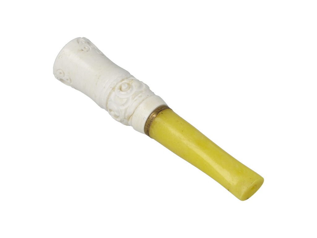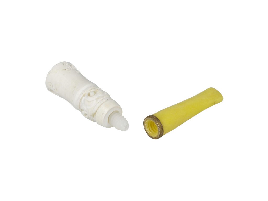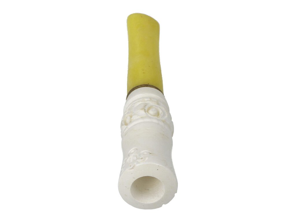 Krátká cigaretová špička Meerschaum bez filtru. Špičky na cigaretu Meerschaum od předního tureckého výrobce produkující nejen cigaretové špičky, ale především kvalitní dýmky z mořské pěny (dýmky Meerschaum). Ručně vyrobená špička z tureckého Meerschaumu je vybavená barevným lesklým náustkem z akrylátu. Hladký lesklý povrch v přírodním odstínu je bohatě zdobený řezaným motivem. Meerschaum je organický nerost (minerál sepiolit, nazývaný též afrodit), který je porézní a plave ve vodě. Špičky z Meerschaumu poskytují kuřákovi požitek z chladného a chutného kouře. Díky poréznosti materiálu navíc absorbují část vlhka a tabákového dehtu, který vzniká při kouření tabáku. Tyto špičky zaujmou svojí bílou barvou, která se po kouření postupně mění na krásné odstíny žluté, červené později zlatohnědé. Cigaretová špička z mořské pěny je dodávaná koženkovém pouzdru.
