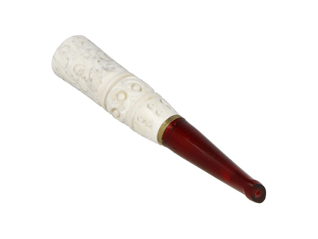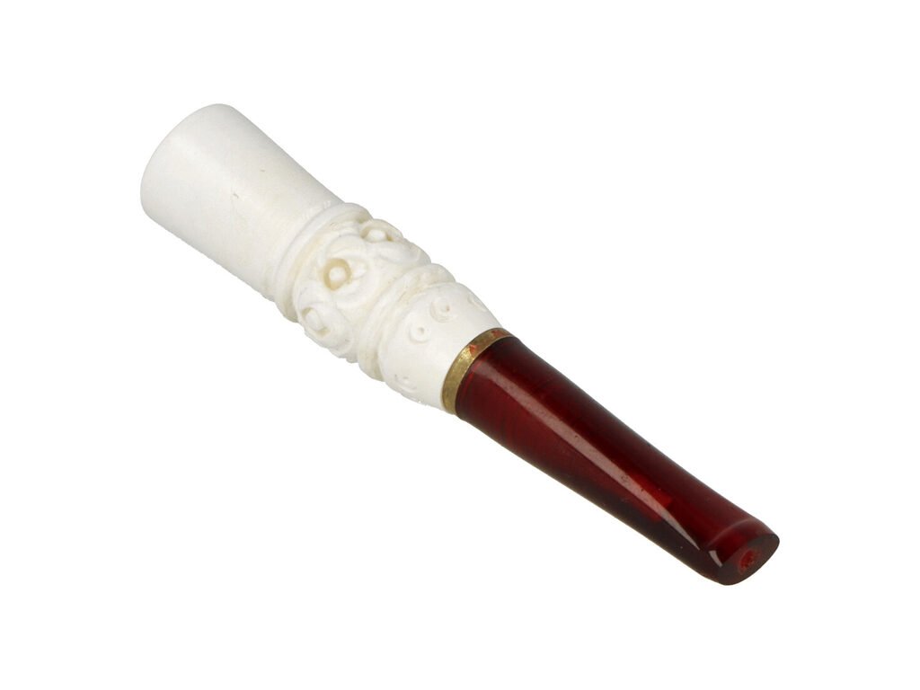 Krátká cigaretová špička Meerschaum bez filtru. Špičky na cigaretu Meerschaum od předního tureckého výrobce produkující nejen cigaretové špičky, ale především kvalitní dýmky z mořské pěny (dýmky Meerschaum). Ručně vyrobená špička z tureckého Meerschaumu je vybavená barevným lesklým náustkem z akrylátu. Hladký pololesklý povrch v přírodním odstínu je bohatě zdobený řezaným motivem. Meerschaum je organický nerost (minerál sepiolit, nazývaný též afrodit), který je porézní a plave ve vodě. Špičky z Meerschaumu poskytují kuřákovi požitek z chladného a chutného kouře. Díky poréznosti materiálu navíc absorbují část vlhka a tabákového dehtu, který vzniká při kouření tabáku. Tyto špičky zaujmou svojí bílou barvou, která se po kouření postupně mění na krásné odstíny žluté, červené později zlatohnědé. Cigaretová špička z mořské pěny je dodávaná koženkovém pouzdru.