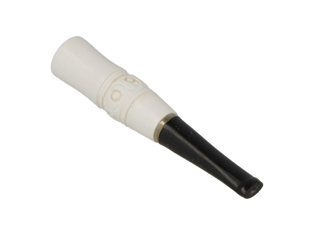 Krátká cigaretová špička Meerschaum bez filtru. Špičky na cigaretu Meerschaum od předního tureckého výrobce produkující nejen cigaretové špičky, ale především kvalitní dýmky z mořské pěny (dýmky Meerschaum). Ručně vyrobená špička z tureckého Meerschaumu je vybavená černým lesklým náustkem z akrylátu. Hladký lesklý povrch v přírodním odstínu je bohatě zdobený řezaným motivem. Meerschaum je organický nerost (minerál sepiolit, nazývaný též afrodit), který je porézní a plave ve vodě. Špičky z Meerschaumu poskytují kuřákovi požitek z chladného a chutného kouře. Díky poréznosti materiálu navíc absorbují část vlhka a tabákového dehtu, který vzniká při kouření tabáku. Tyto špičky zaujmou svojí bílou barvou, která se po kouření postupně mění na krásné odstíny žluté, červené později zlatohnědé. Cigaretová špička z mořské pěny je dodávaná koženkovém pouzdru.