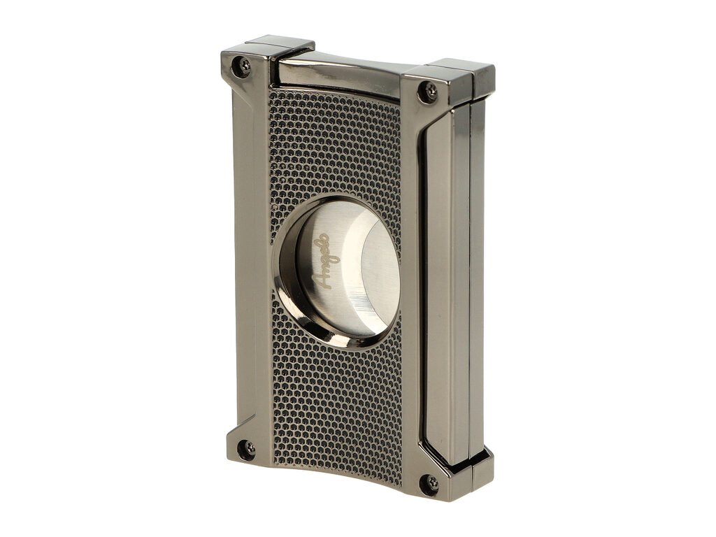 Dvoubřitý doutníkový ořezávač Angelo Colossus. Masivnější kovový ořezávač na doutníky má povrch v lesklém gunmetalovém provedení. Na přední i zadní straně je zdobený atraktivní perforovanou mřížkou. Po stisknutí tlačítka na horní straně se břity rozjedou od sebe a ořezávač je připravený k použití. Ostré břity vyrobené z kvalitní oceli zajistí rychlý a čistý ořez vašeho doutníku. Ořezávač na doutníky lze postavit na stůl jako vkusný doplněk Vašeho interiéru. Doutníkový ořezávač je dodávaný v dárkové krabičce.