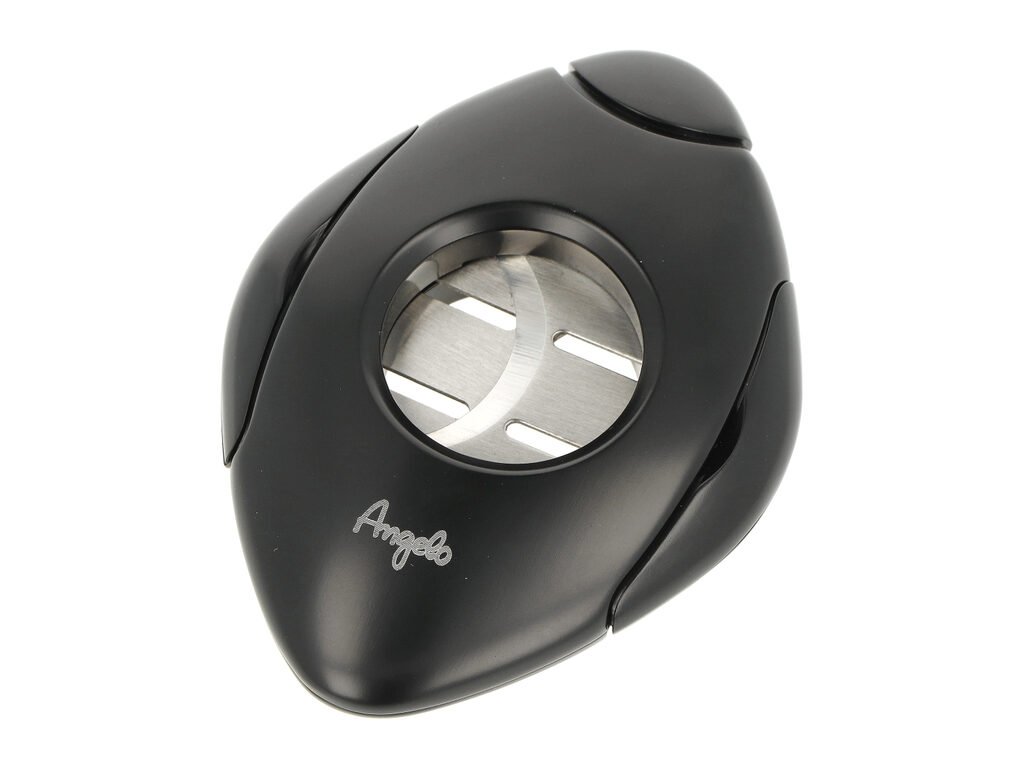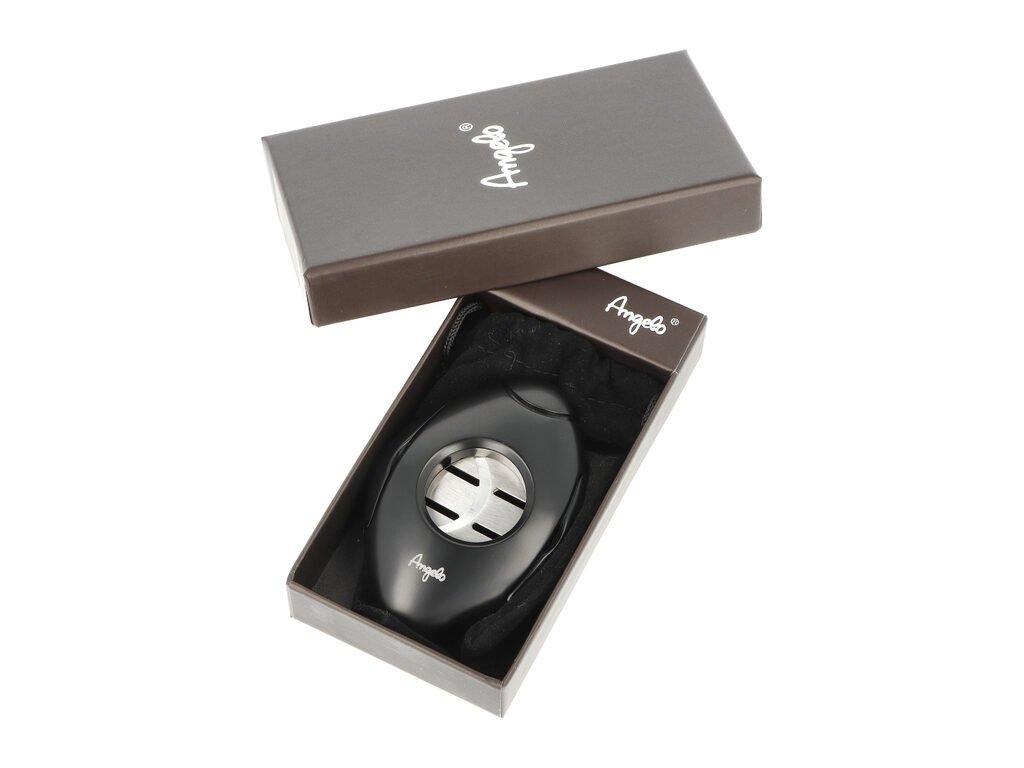 Dvoubřitý doutníkový ořezávač Angelo Shape. Kovový ořezávač na doutníky kosočtvercového tvaru se zaoblenou hranou je v černém pololesklém provedení. Po stisknutí tlačítka na horní se břity rozjedou od sebe a ořezávač je připravený k použití. Ostré břity vyrobené z kvalitní oceli zajistí rychlý a čistý ořez vašeho doutníku. Doutníkový ořezávač je dodávaný v dárkové krabičce.