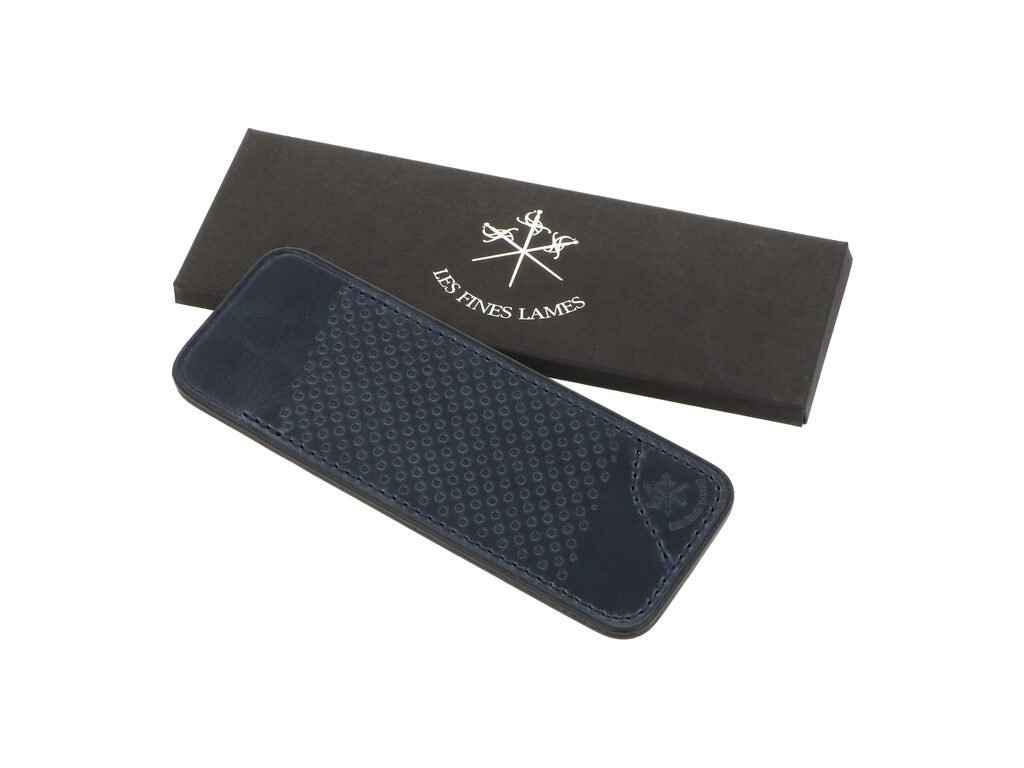 Exklusivní kožené pouzdro na ořezávač Les Fines Lames Racing Petrol Blue. Elegantní pouzdro pro ořezávače Les Fines Lames je ve tmavě modrém petrolejovém odstínu. Jeho přední strana je zdobená jemným vytlačeným vzorem a efektním obšívkou, v pravém rohu najdeme logo Les Fines Lames. Zadní strana pouzdra je hladká. Pouzdro, ručně šité a vyrobené z kvalitní telecí kůže ochrání Vás ořezávač před poškozením a poškrábáním. Díky jeho tvaru v něm ořezávač pevně drží a nevypadne. Pouzdro je dodávané v originální papírové krabičce. Zobrazený ořezávač není součástí dodávky.