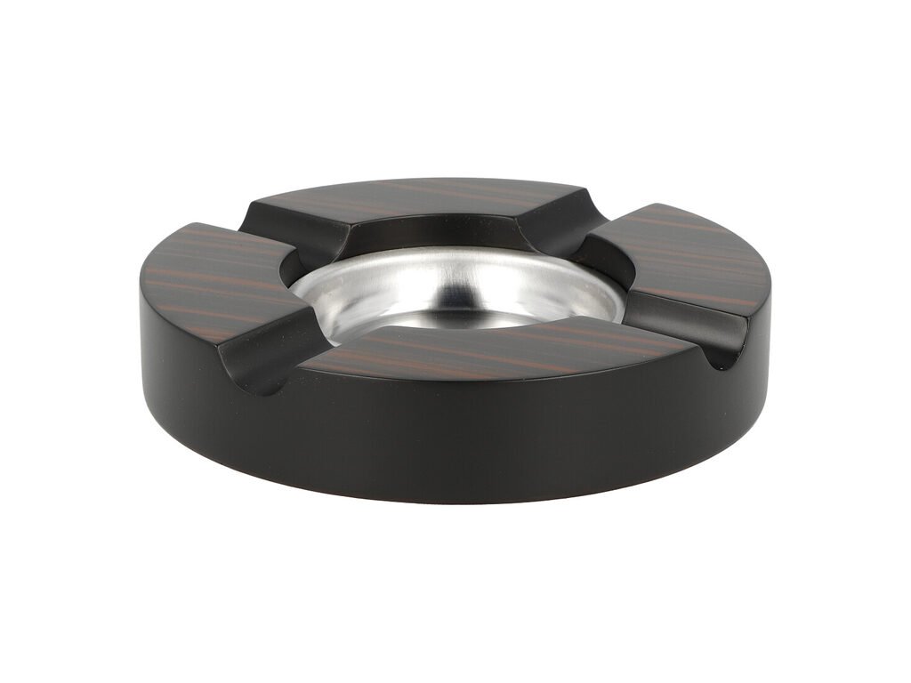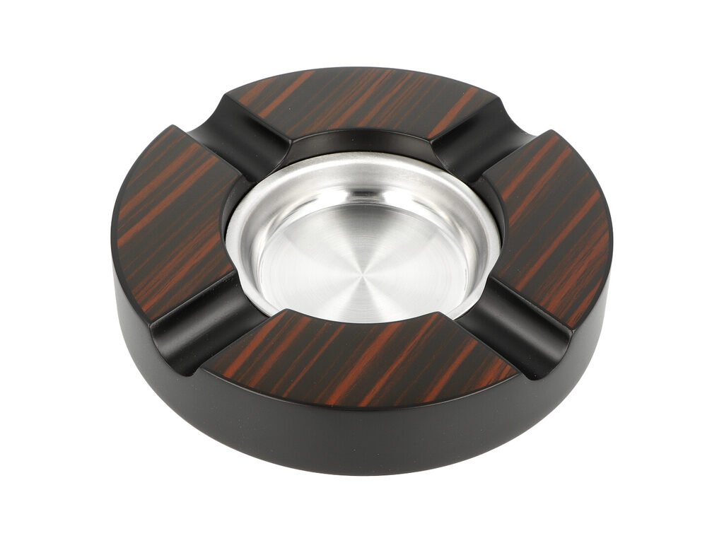 Doutníkový popelník Ebony na 4 doutníky. Dřevěný popelník na doutníky ve tmavě hnědém provedení s kresbou má matný povrch. Kulatý popelník s odkladem pro čtyři doutníky má vyjímatelnou nerezovou vložku na popel, která je přichycená magnetem. Díky hladkému povrchu vložky se popelník dobře čistí. Jemná tkanina na spodní straně popelníku zabraňuje poškození povrchu, na kterém je položený. Popelník je dodávaný v kartonové krabičce.