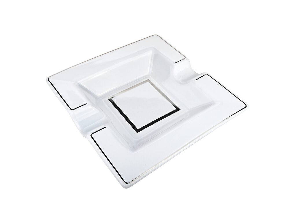Elegantní doutníkový popelník na 2 doutníky. Keramický popelník na doutníky s lesklou glazurou je zdobený stříbrnou linkou. Rozměry popelníku jsou 19x19x3,7cm.