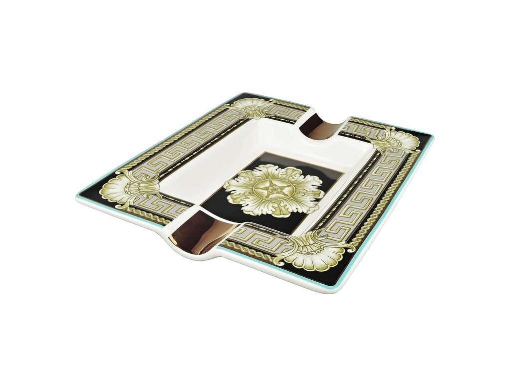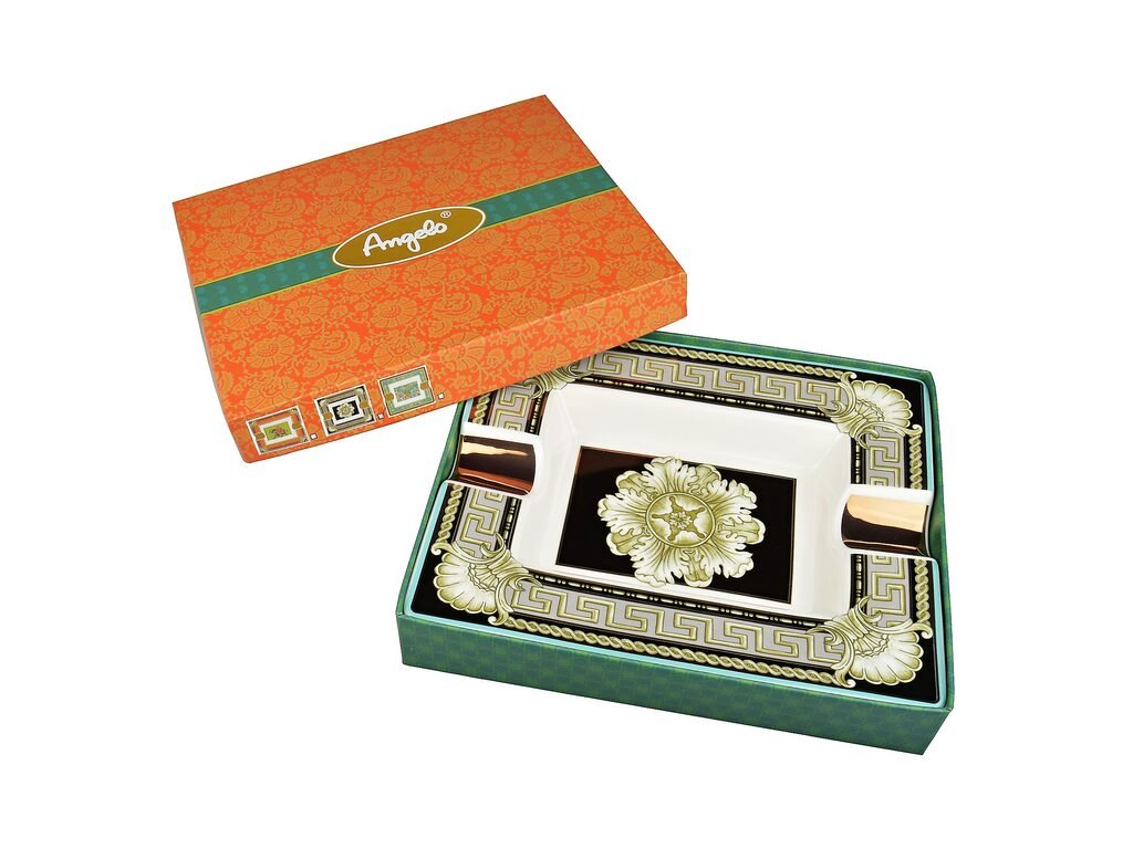 Atraktivní doutníkový popelník na 2 doutníky. Hranatý keramický popelník ve tvaru obdélníku s gotickým motivem je zdobený zlatými prvky. Kvalitně zpracovaný glazurovaný povrch popelníku je v lesklém provedení. Popelník na doutníky je dodávaný v dárkové krabičce. Rozměry popelníku: 20,5x17,2x3,1cm.