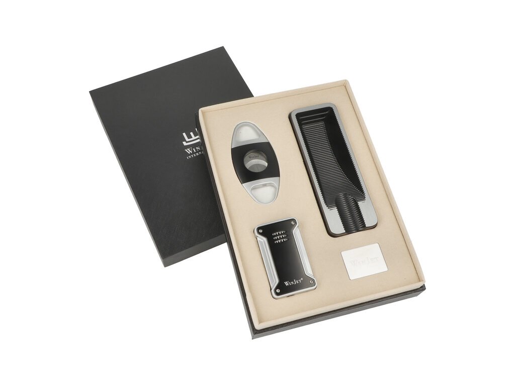 Doutníková sada Winjet s ořezávačem, popelníkem a zapalovačem na doutníky. Dárková sada pro kuřáky doutníků je v atraktivní černo stříbrné kombinaci. Praktický doutníkový set obsahuje popelník na jeden doutník vyrobený z hliníku, doutníkový zapalovač s jednou tryskou a kovový dvoubřitý ořezávač na doutníky. Ostré kovové břity ořezávače zajistí rychlý a čistý ořez vašeho doutníku. Plnicí ventil plynu a nastavení intenzity plamene je umístěné na spodní straně zapalovače. Na levé boční straně najdeme okénko, kde můžeme sledovat hladiny plynu v zapalovači. Sada je dodávaná v dárkové krabičce.