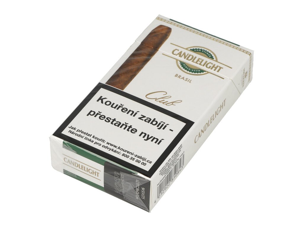 Suché doutníky Candlelight Club Brasil. Oblíbené strojově balené malé doutníčky jsou vyráběné v Německu. Při balení je použito tabáků z Brazílie, Dominikánské republiky a Kuby. Jemné a lehce kořeněné cigarillos jsou balené v celofánu po 10 ks v papírové krabičce. Prodej po celém balení(boxu) 10 krabiček. Cena je uvedená za jednu krabičku. Jelikož se jedná o doutníky typu suchého, není je nutné skladovat v humidoru.
