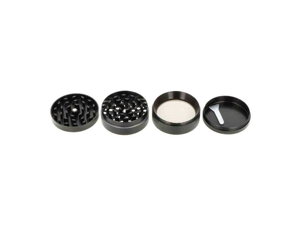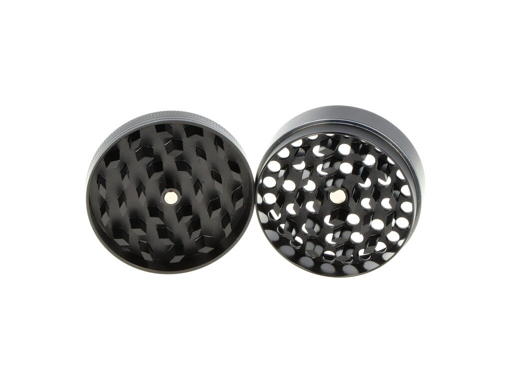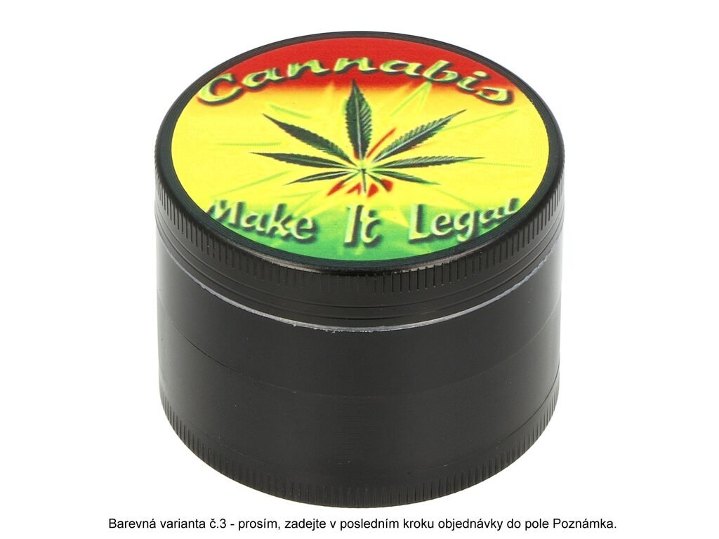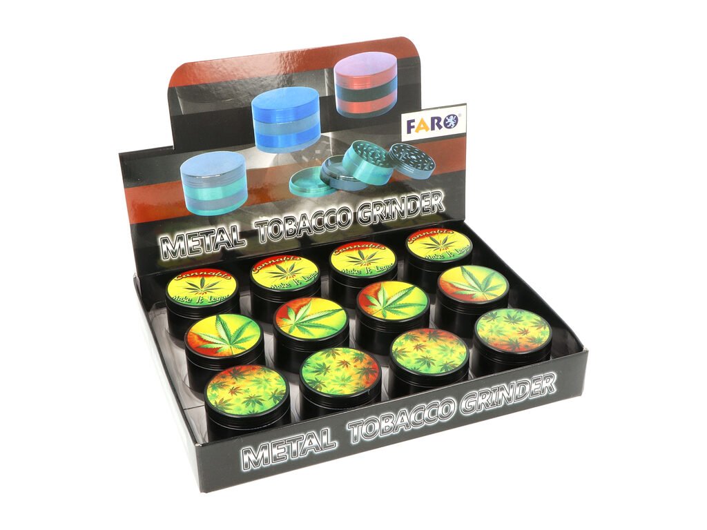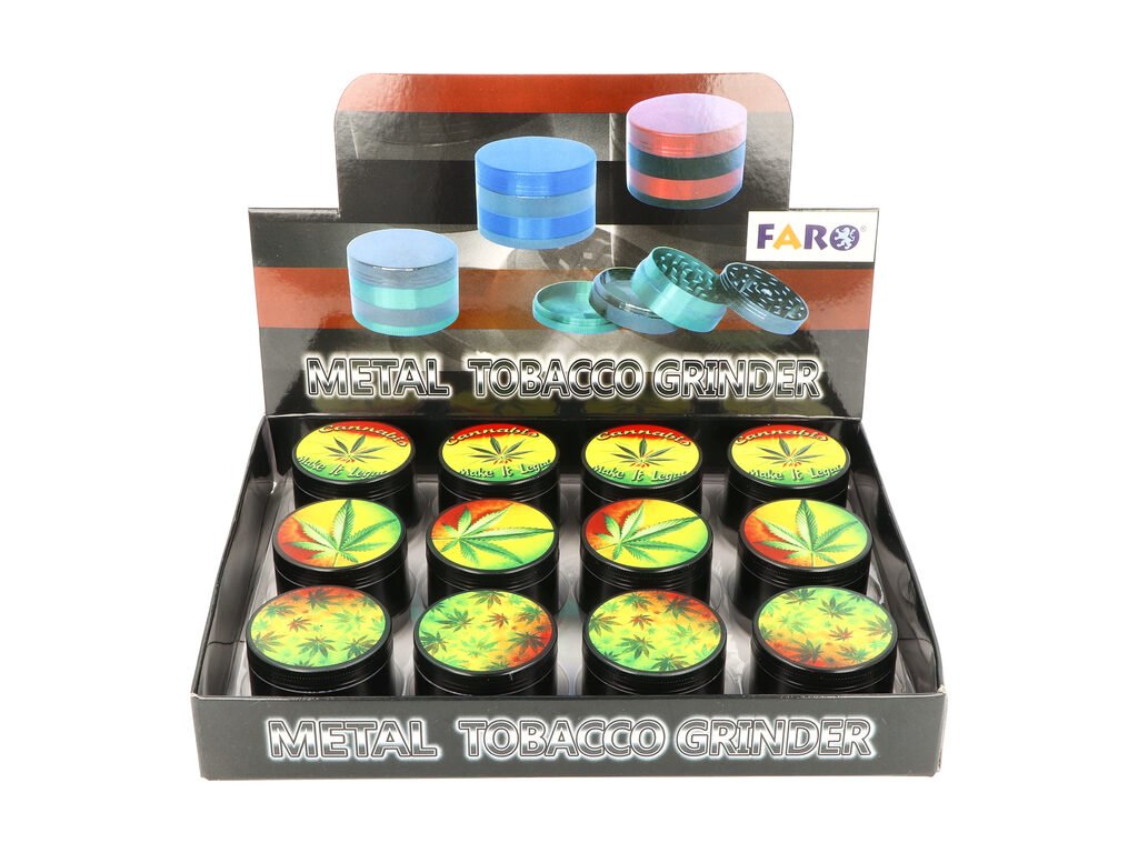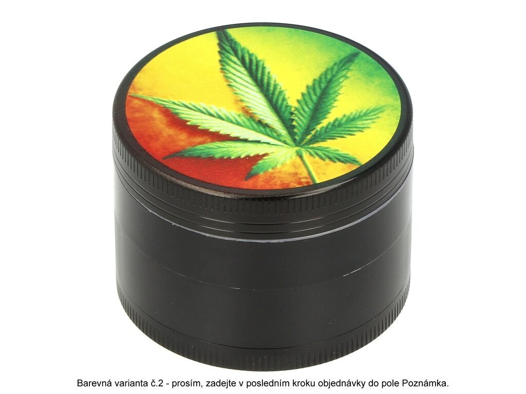 Kovový drtič tabáku a bylin Faro Weed. Čtyřdílná hliníková drtička bylinek se závitem, sítkem a zásobníkem na tabák je vyrobena z kvalitního hliníku CNC technologií. Drtič v pololesklém černém provedení má povrch s jemným drážkováním, díky kterému se dobře drží a neklouže v ruce. Horní víčko je zdobené barevným potiskem s motivem Cannabis. Jednotlivé díly drtičky na tabák jsou pevně spojené na závit, víčko je na magnet. Broušené ostří nožů ve tvaru diamantu velmi jemně nadrtí vaši směs do požadované hrubosti. Cena je uvedena za 1 ks. Před odesláním objednávky uveďte číslo barevného provedení do poznámky.