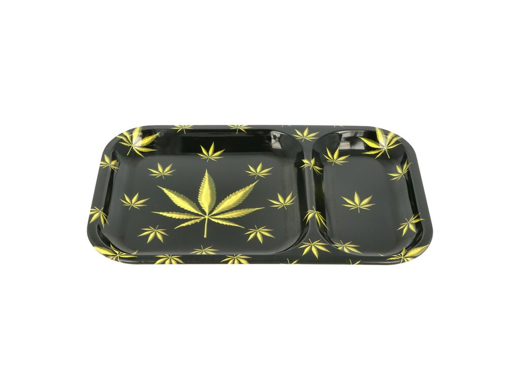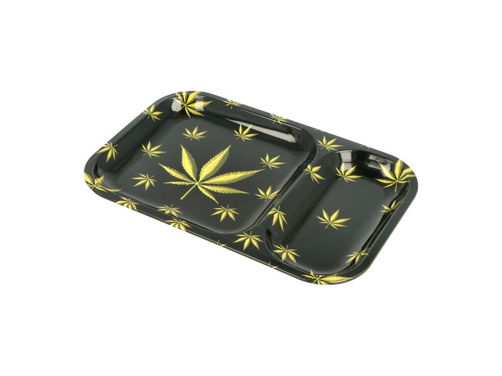 Tácek na balení cigaret Leaf. Plechová balící podložka se žlutými listy konopí je v černém lesklém provedení. Kovový tácek k balení cigaret je rozdělený na dva odkládací prostory pro Vaše byliny nebo tabák a další kuřácké potřeby, které potřebujete při výrobě vlastních cigaret. S praktickou podložkou zamezíte nepořádku na stole a současně máte vše potřebné na jednom místě.