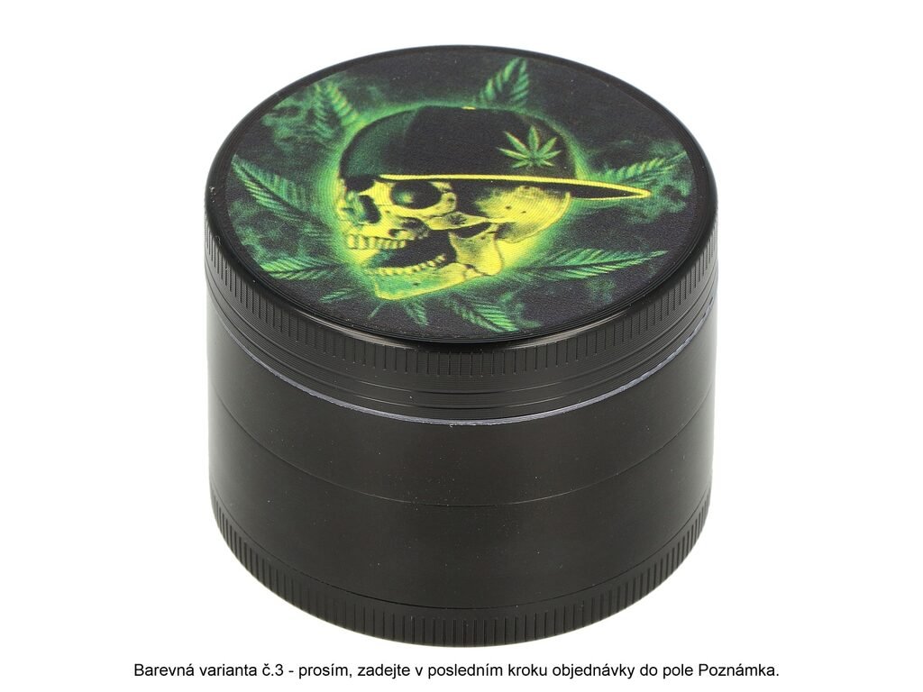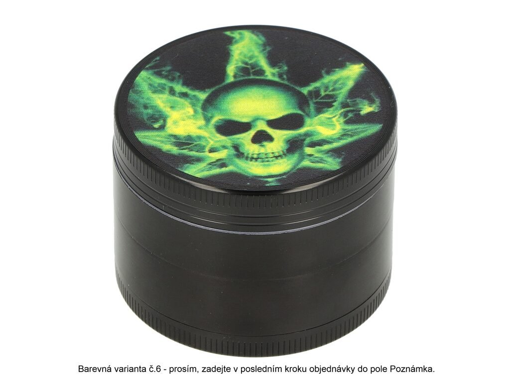 Kovový drtič bylin a tabáku Wildfire Mix Skulls. Menší čtyřdílná drtička konopí a jiných bylinek se závitem, sítkem a zásobníkem je v lesklé černé barvě. Díky jemně drážkovanému povrchu se drtič dobře při drcení drží. Horní strana víčka je zdobená zeleno žlutým tištěným motivem s lebkou. Jednotlivé díly kovové drtičky na tabák jsou pevně spojené na závit, víčko je na magnet. Precizně broušené ostří nožů ve tvaru diamantu velmi jemně nadrtí vaši směs do požadované hrubosti. Kovový drtič je vyrobený CNC technologií z kvalitního hliníku. Cena uvedena za 1 ks. Před odesláním objednávky uveďte číslo barevného provedení do poznámky.