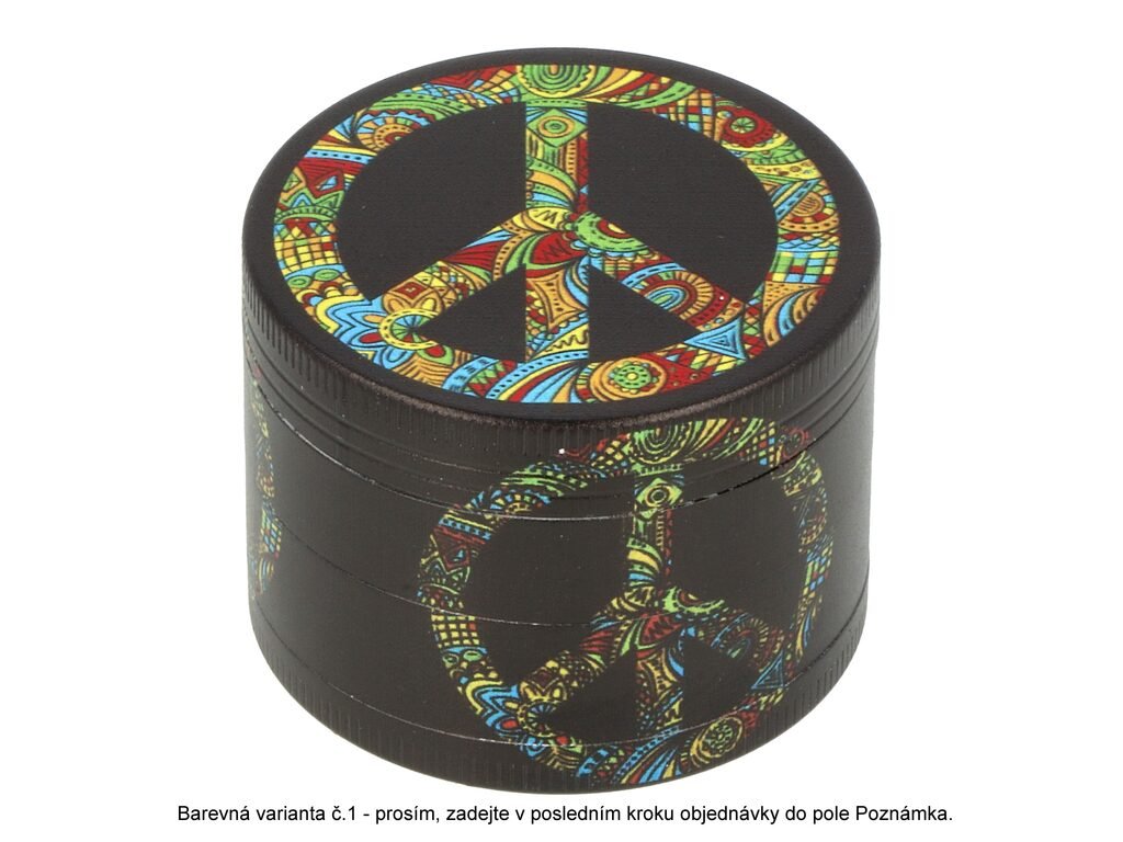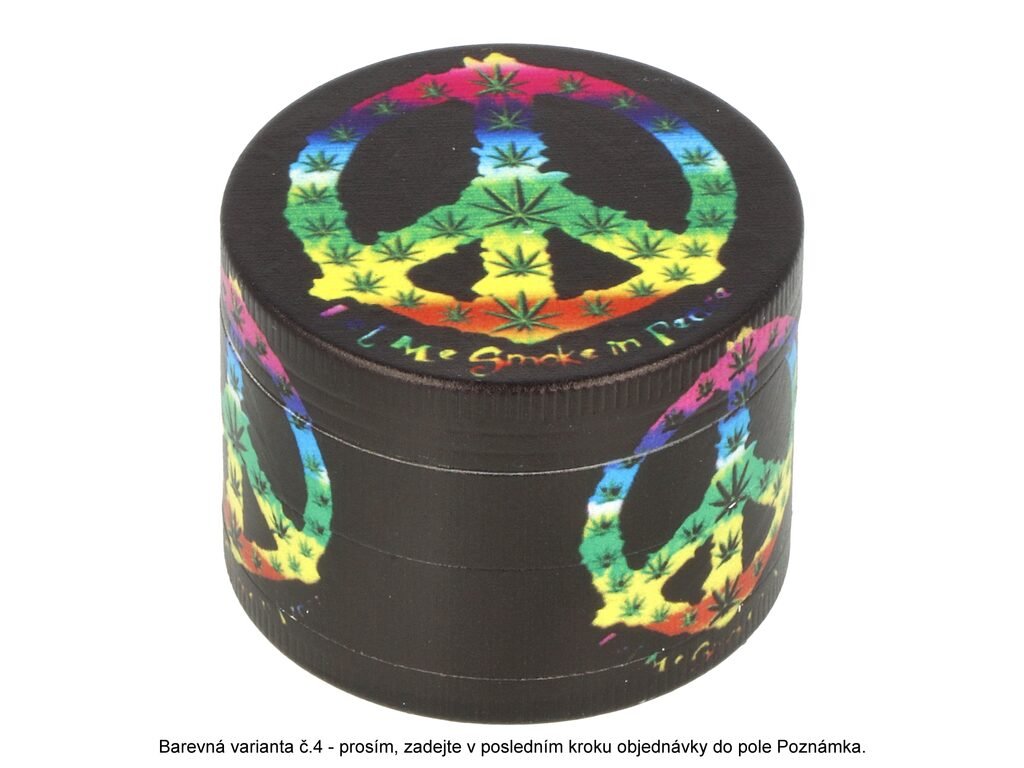 Kovový drtič tabáku Wildfire Peace je čtyřdílná drtička se závitem, sítkem a zásobníkem na tabák, která je v černém pololesklém provedení s jemnou strukturou na povrchu. Drtič je zdobený barevný motivem Peace nejen na víčku, ale i po celém obvodu. Jednotlivé díly kovové drtičky na tabák jsou pevně spojené na závit, víčko je na magnet.
