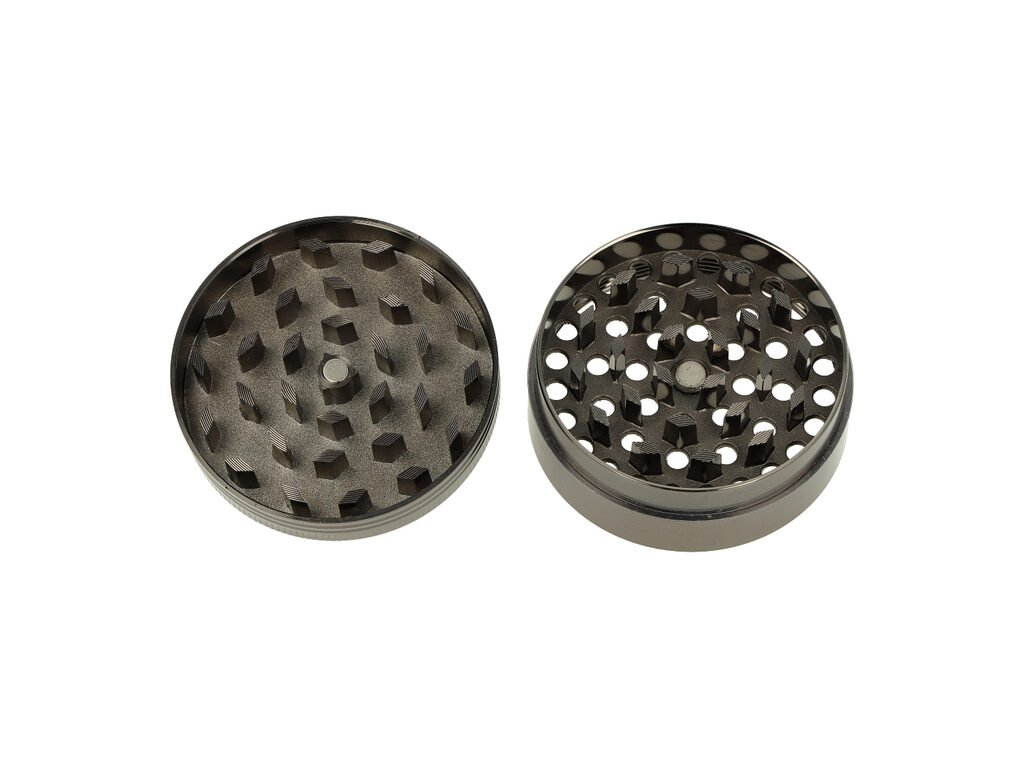 Atraktivní kovová drtička tabáku a bylin Super Heroes Skull. Čtyřdílný hliníkový drtič konopí a dalších bylinek se závitem, sítkem a zásobníkem je vyroben z eloxovaného hliníku CNC technologií. Drtička v gunmetalovém provedení má hladký lesklý povrch. Na víčku najdeme lebku ve zlaté barvě, kterou doplňují broušené kamínky. Drtící část se zásobníkem je pevně spojená na závit, víčko na magnet. Toto zajišťuje pohodlné používání drtiče a současně pevný spoj. Broušené ostří nožů ve tvaru diamantu velmi jemně nadrtí vaši směs do požadované hrubosti. Drtič je dodávaný v kartonové krabičce.