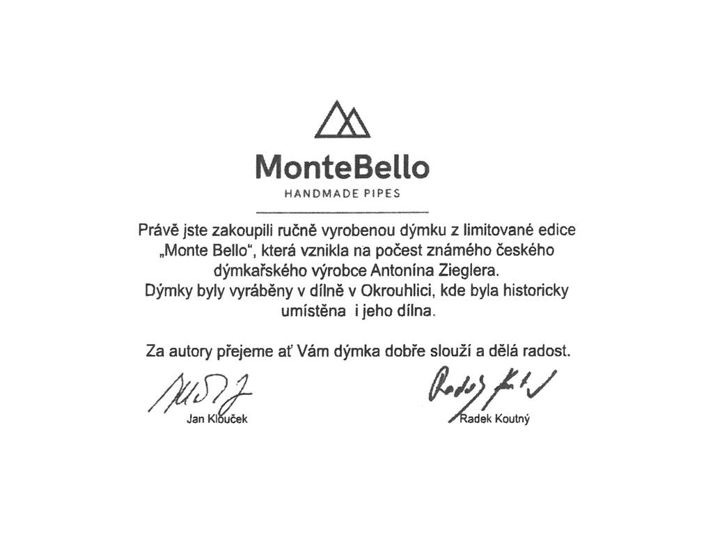 Na ruční výrobu dýmek Monte Bello jsou použité výběrové kusy briaru ze Španělska a kvalitní akrylátové náustky z Cumberlandu. Dýmku dodáváme v sametovém stahovacím sáčku a originální dárkové krabičce. Součástí dodávky není filtr.