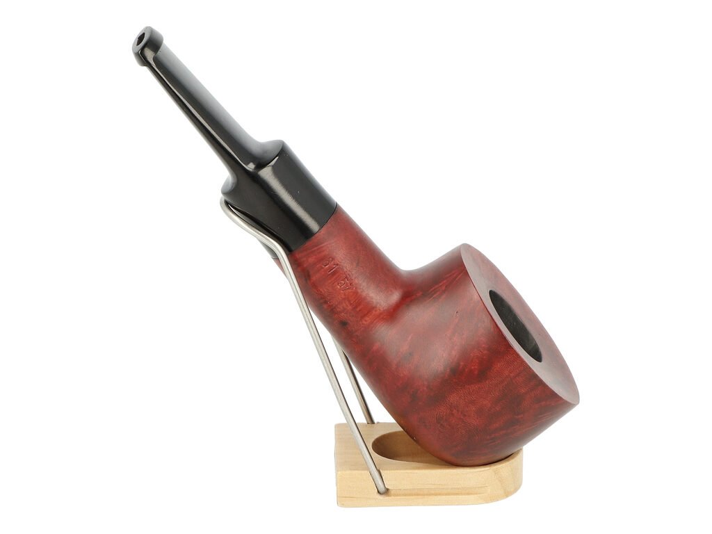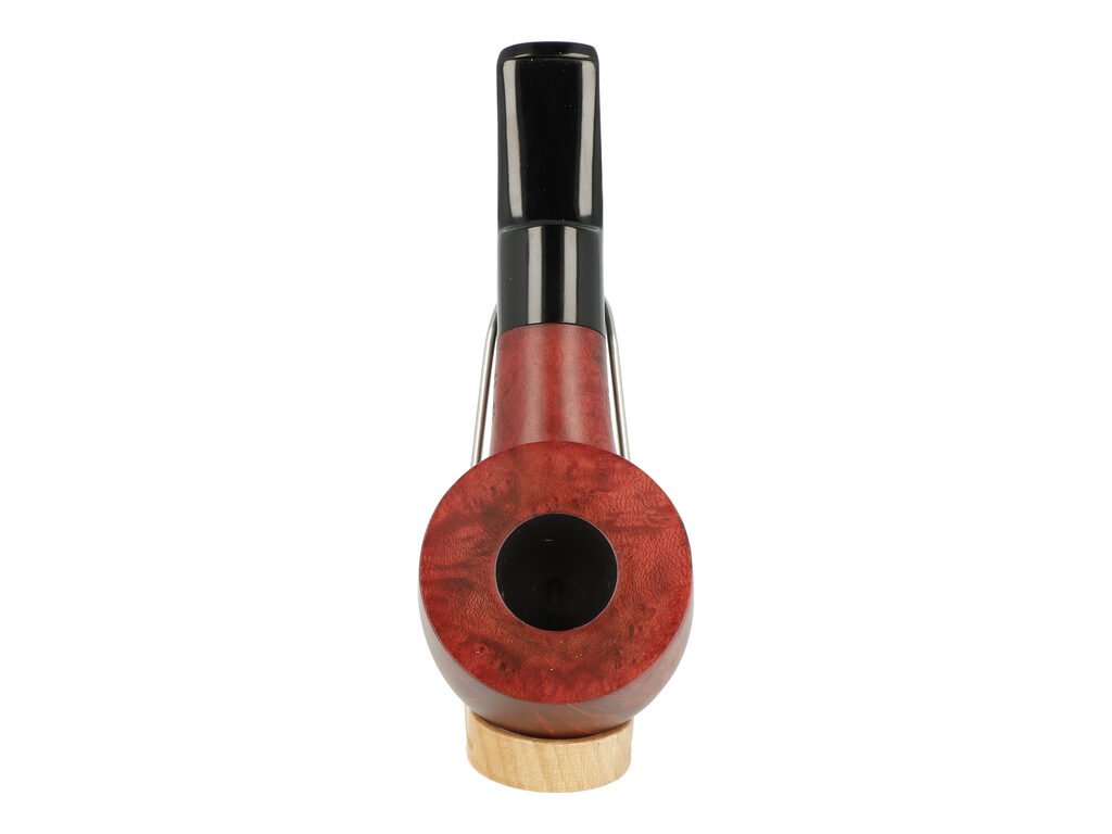 Rovná briárová dýmka je ve tmavším červeném provedení s výraznější kresbou. Na boku je dýmka zdobená rytým nápisem "BPK". Hlava dýmky je polomatná, černý akrylátový náustek lesklý.