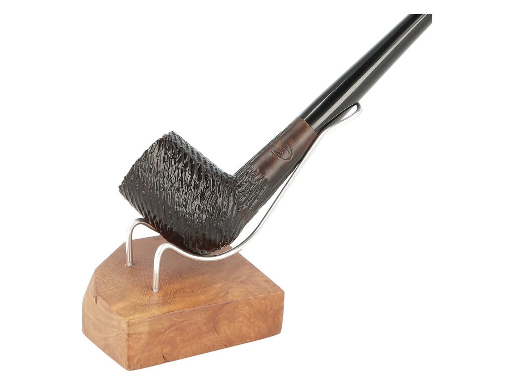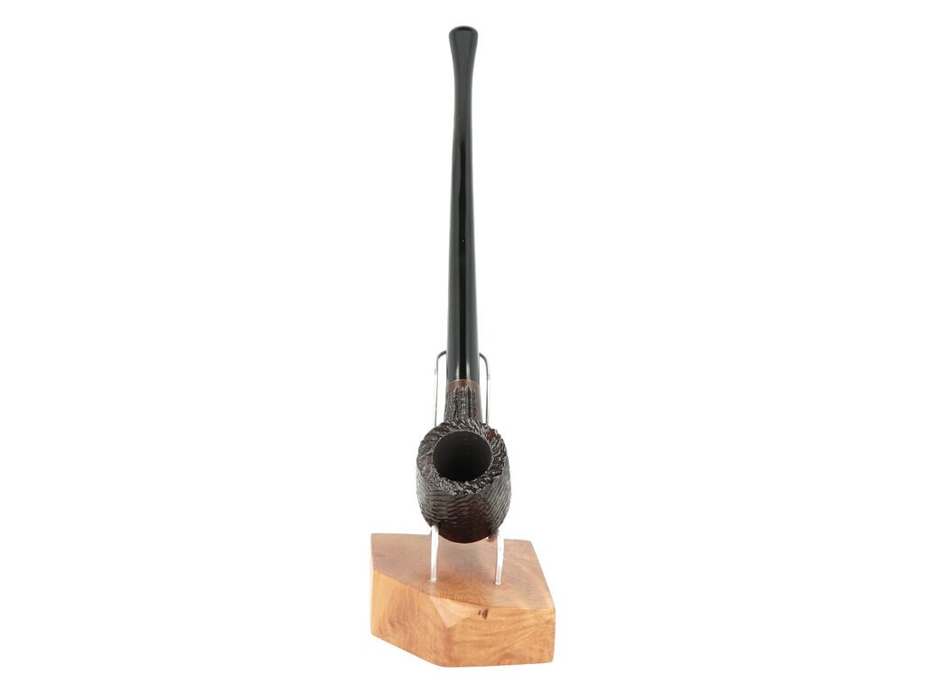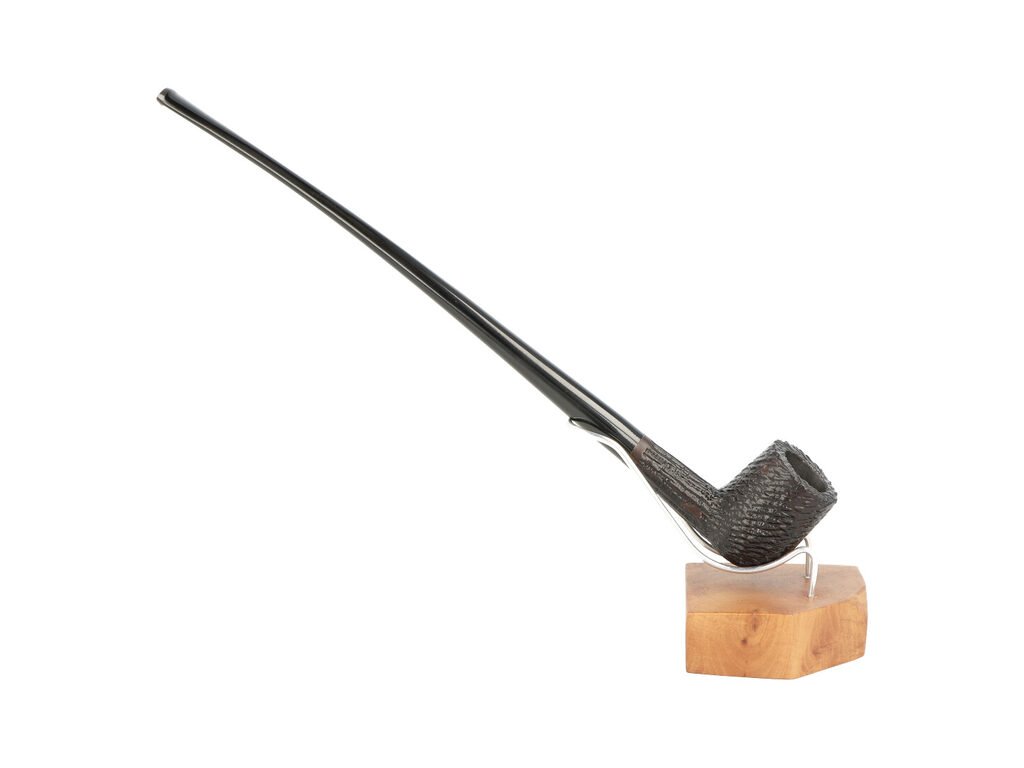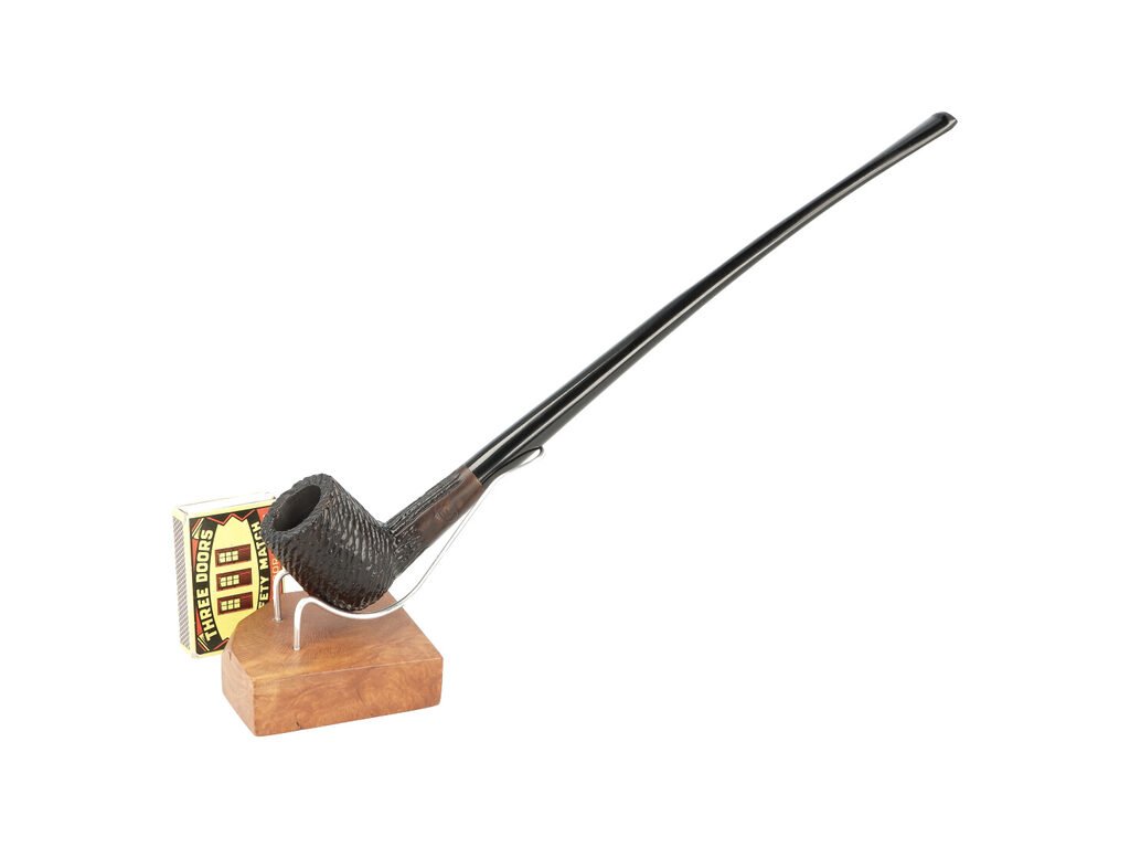Dlouhá prohnutá tzv. televizní dýmka s chladičem je ve tmavě hnědém provedení s málo výraznou kresbou. Hlava dýmky je lesklá, černý ebonitový náustek také.