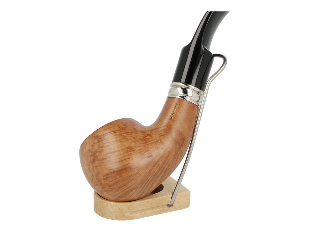Zahnutá briárová dýmka s ozdobným kovovým kroužkem je ve hnědém provedení s jemnou kresbou. Na boku je dýmka zdobená rytým nápisem "Dorex". Hladká hlava dýmky je pololesklá, černý akrylátový náustek lesklý.