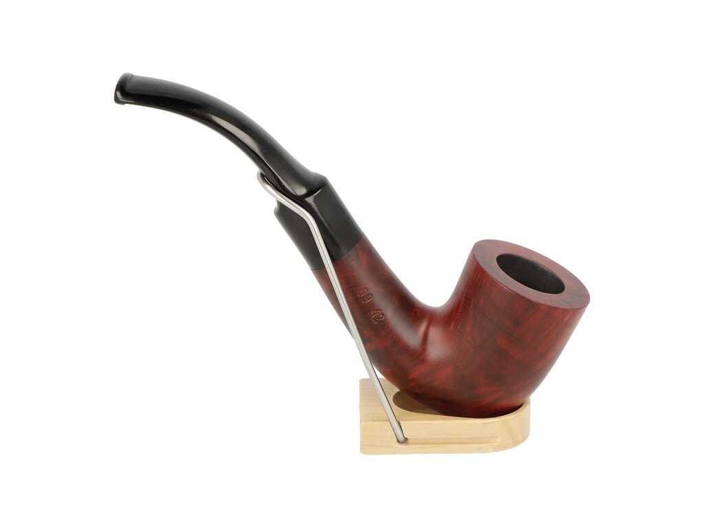 Zahnutá dýmka je ve tmavším bordovém provedení s méně výraznou kresbou. Na boku je dýmka zdobená rytým nápisem "Dorex". Hlava dýmky je polomatná, černý ebonitový náustek lesklý.