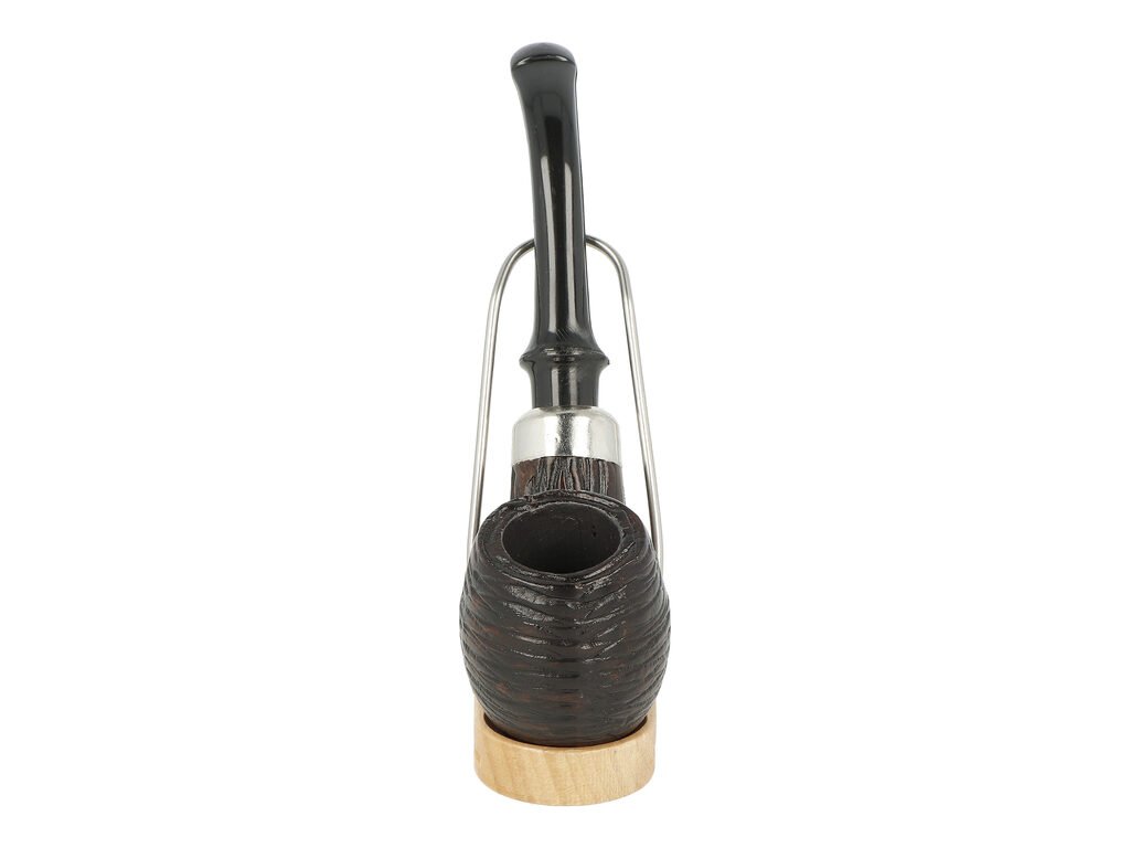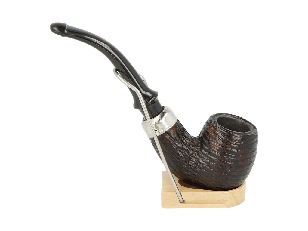 Zahnutá briárová dýmka je ve tmavě hnědém provedení s méně výraznou kresbou. Na boku dýmky najdeme rytý nápisem "BPK". Hlava dýmky je pololesklá, černý ebonitový náustek lesklý.