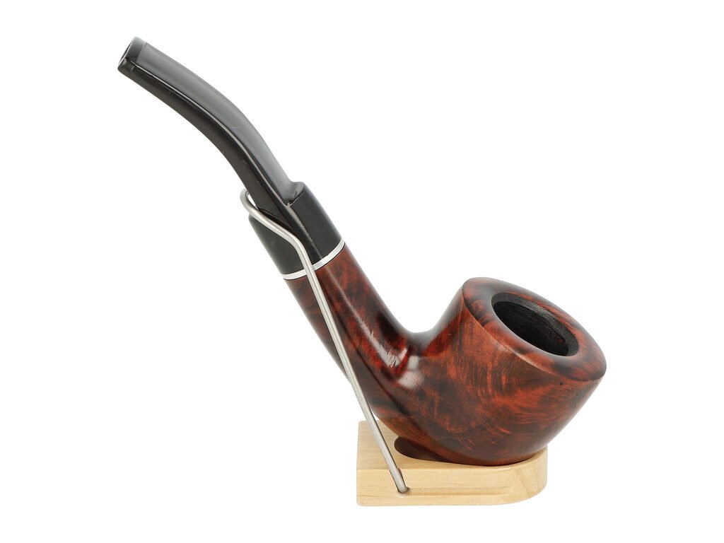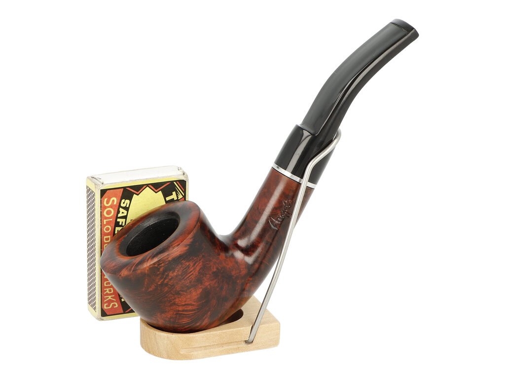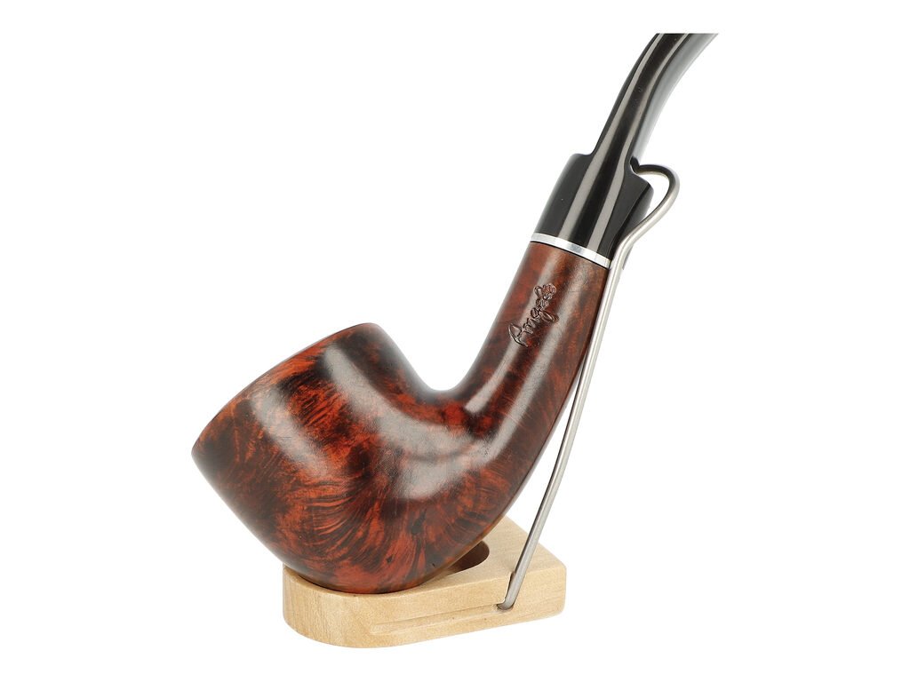 Zahnutá brierová dýmka Angelo s filtrem 9 mm. Dýmka vyrobená z brierového dřeva je ukončená akrylátovým náustkem. Dýmky Angelo jsou vhodnou volbou pro každodenní kouření díky skvělému poměru cena vs výkon. Dýmka je dodávaná bez filtru. Zobrazený stojánek není součástí balení dýmky.