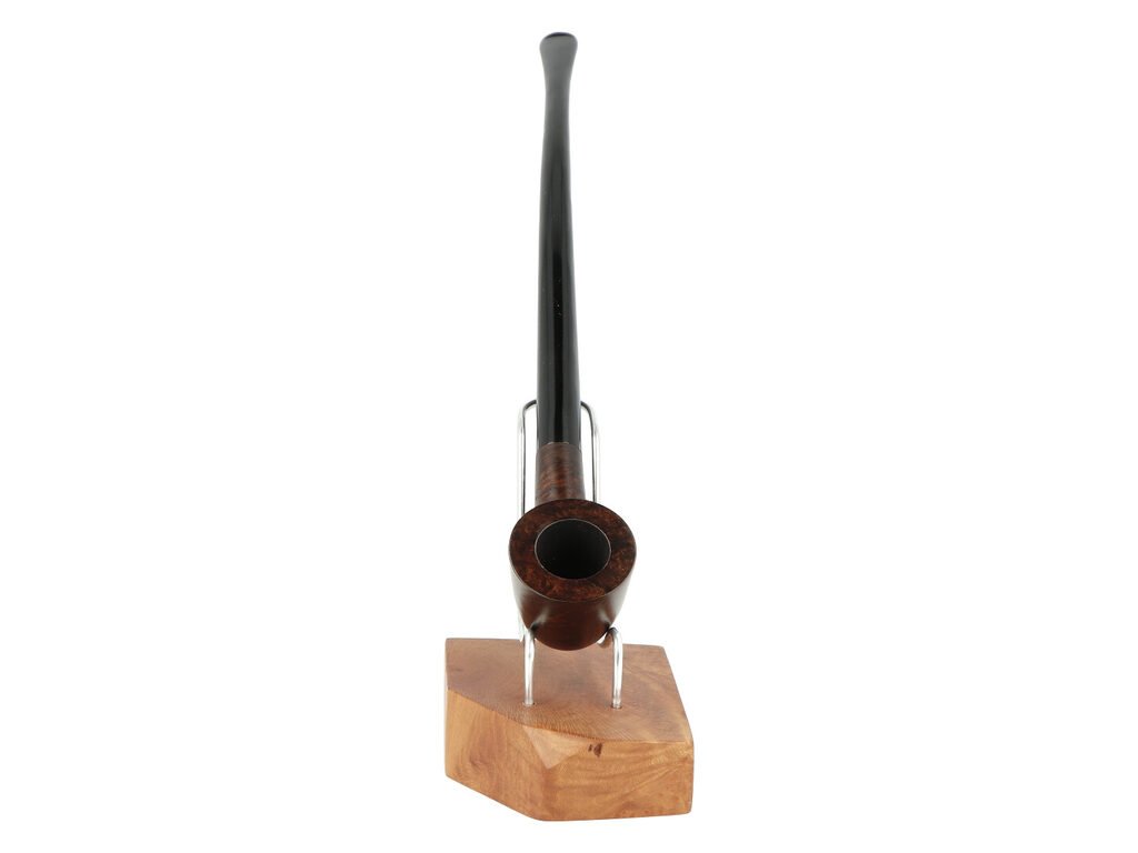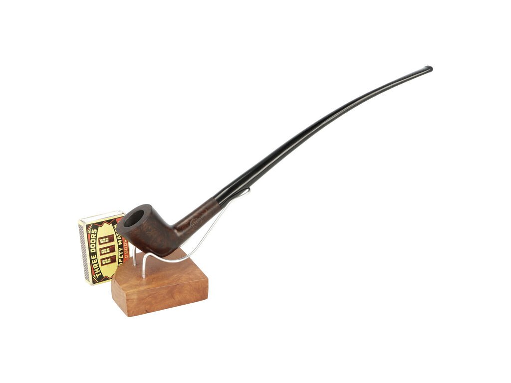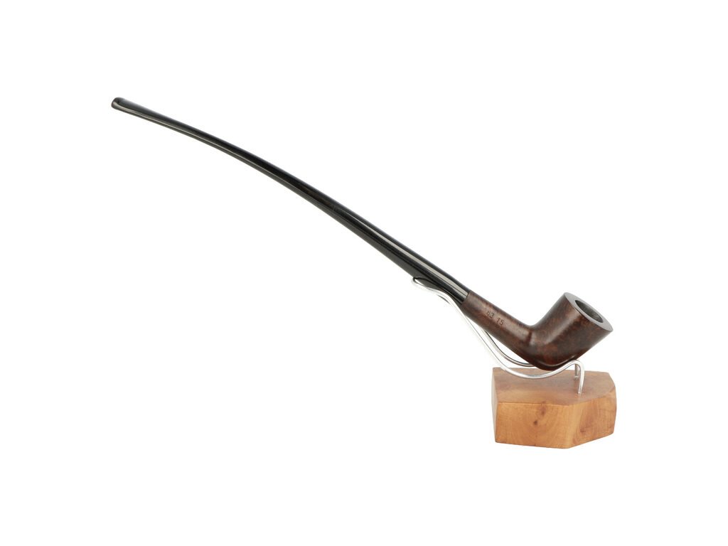 Prohnutá dlouhá tzv. televizní dýmka s chladičem je ve hnědo oranžovém provedení s výraznější kresbou. Hladká hlava dýmky je polomatná, dlouhý akrylátový náustek taktéž.