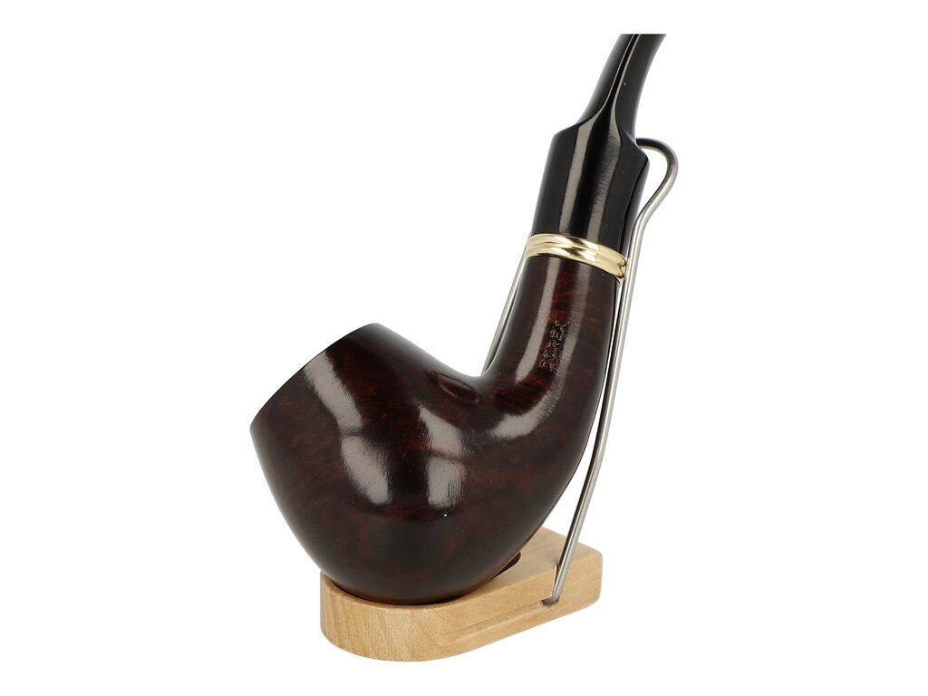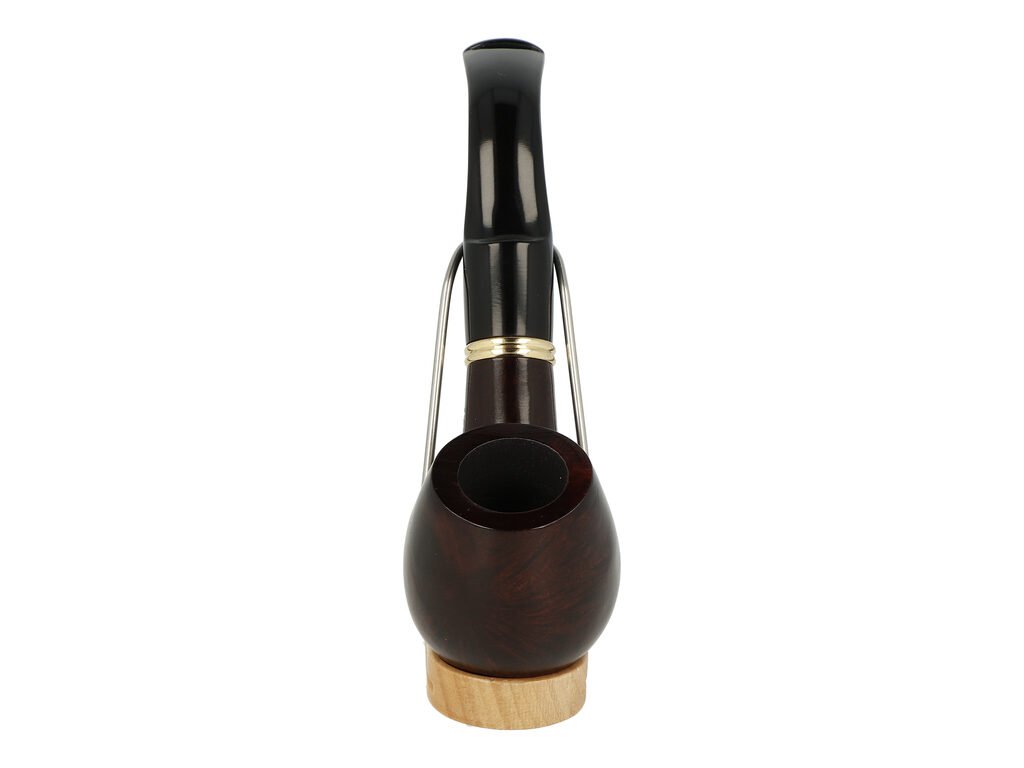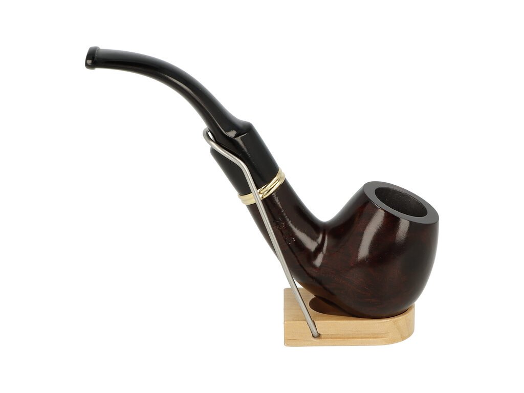 Zahnutá dýmka s filtrem je ve hnědo bordovém provedení s výraznou kresbou. Mezi troubelem a náustkem je vložený ozdobný zlatý kroužek. Hladká hlava dýmky je lesklá, černý akrylátový náustek taktéž.
