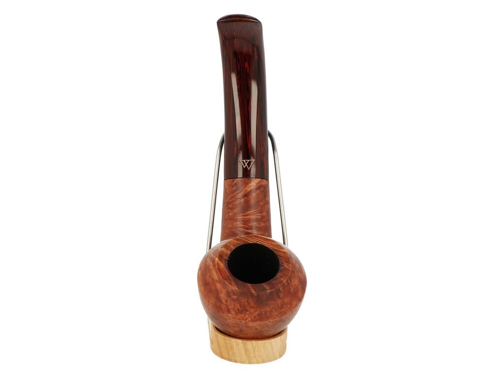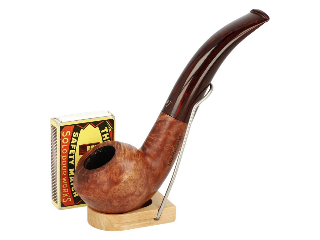 Zahnutá brierová dýmka s filtrem je ve hnědém provedení s výraznější kresbou. Dýmka je na boku zdobená rytým nápisem "MonteBello". Hladká hlava dýmky je lesklá stejně jako barevný náustek s jemnou kresbou.