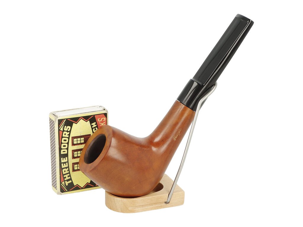 Mírně zahnutá dýmka Angelo s filtrem 9 mm je ve světle hnědém provedení s jemnou kresbou. Na boční straně dýmky najdeme rytý nápis "Angelo". Hlava dýmky je lesklá, černý akrylátový náustek taktéž.