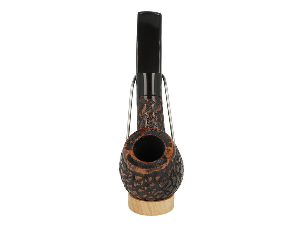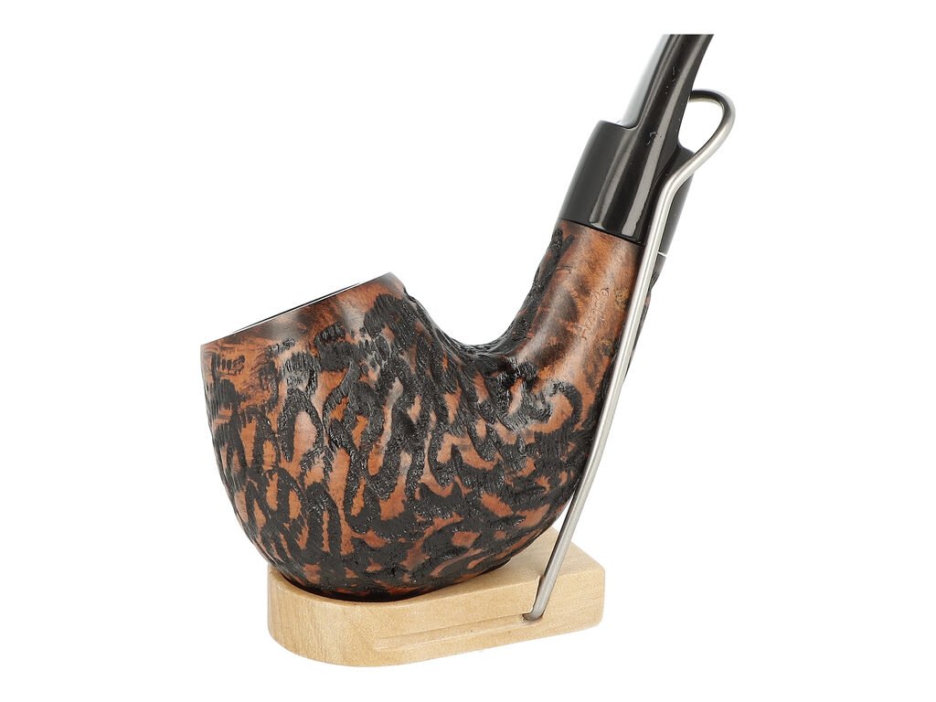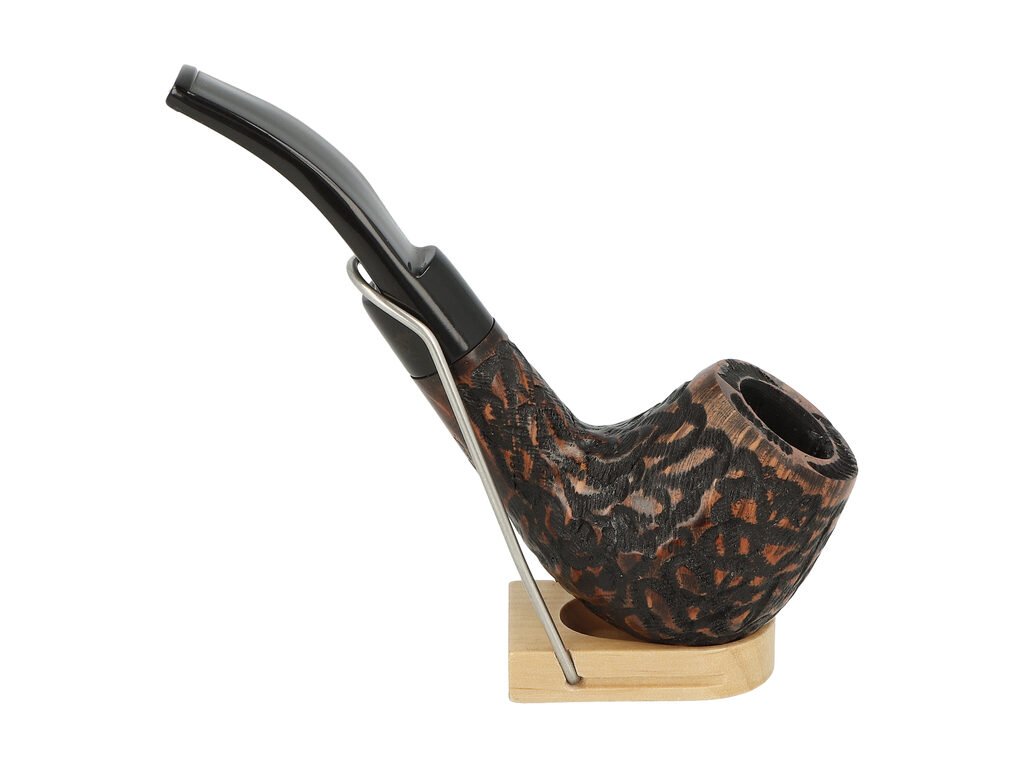 Zahnutá dýmka Angelo s filtrem 9 mm je ve tmavě hnědém provedení s jemnou kresbou. Na boční straně dýmky najdeme rytý nápis "Angelo". Hlava dýmky je pololesklá, černý akrylátový náustek lesklý.