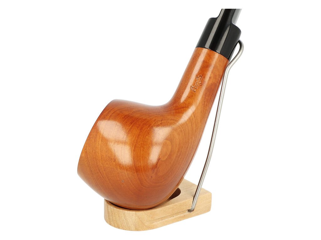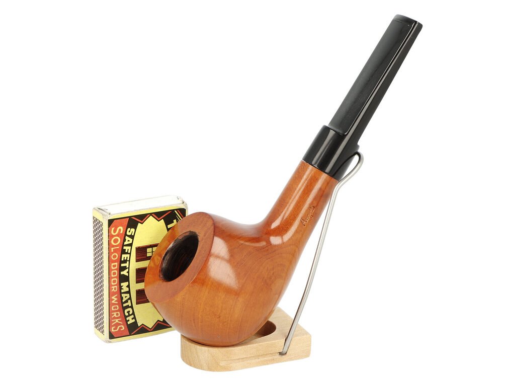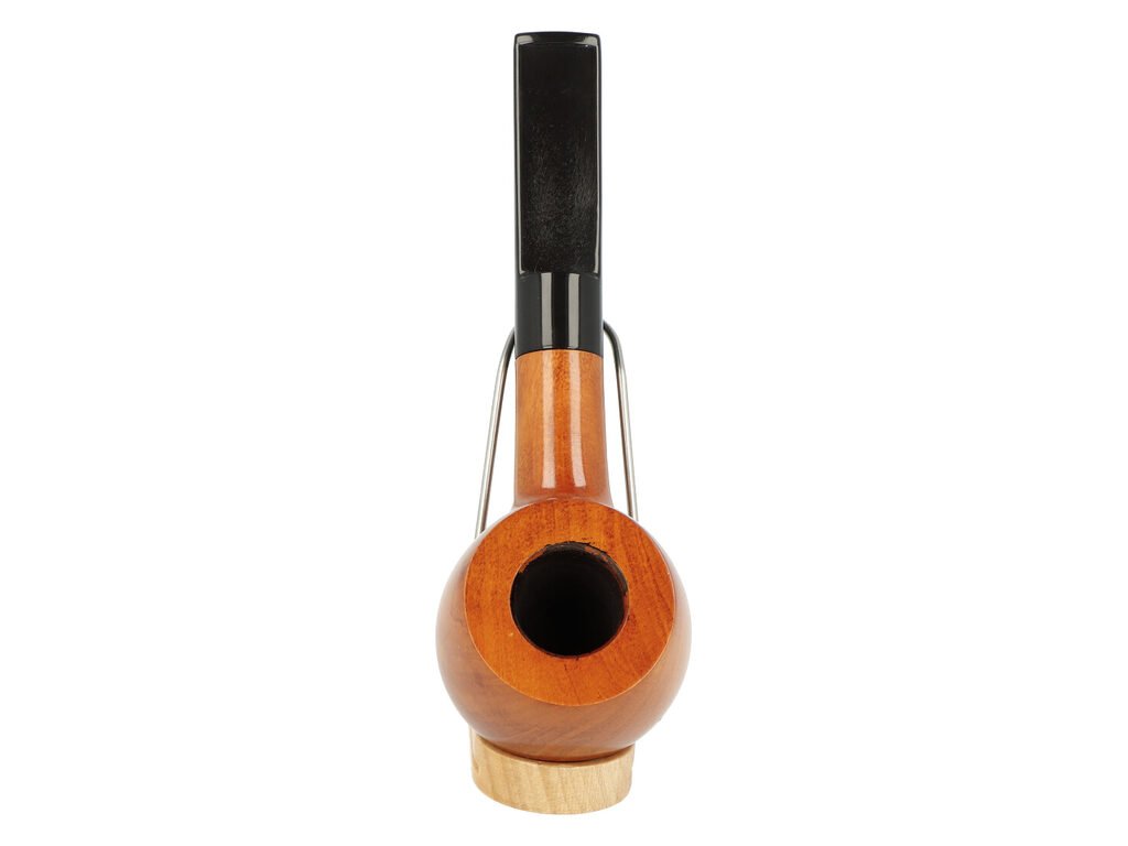 Mírně zahnutá dýmka Angelo s filtrem 9 mm je ve tmavším hnědo oranžovém provedení s jemnou kresbou. Na boční straně dýmky najdeme rytý nápis "Angelo". Hlava dýmky je lesklá, černý akrylátový náustek taktéž.