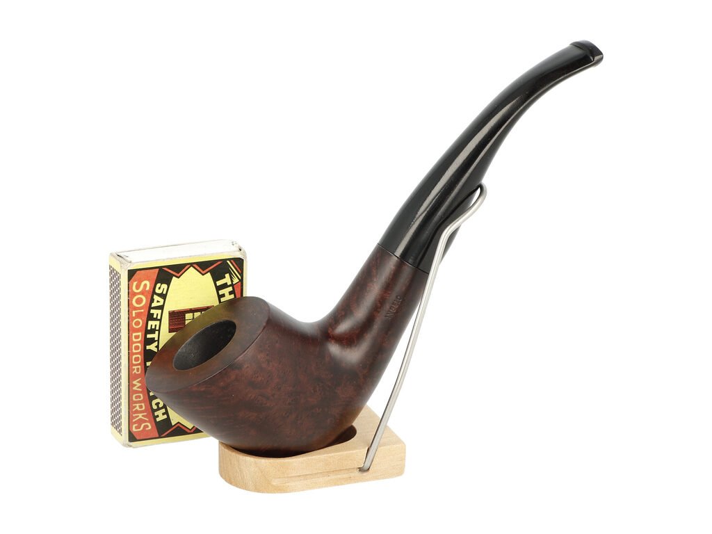 Zahnutá dýmka je ve tmavém hnědém provedení s jemnou kresbou. Na boku dýmky najdeme rytý nápis "Angelo". Hladká hlava dýmky je lesklá, černý ebonitový náustek také.