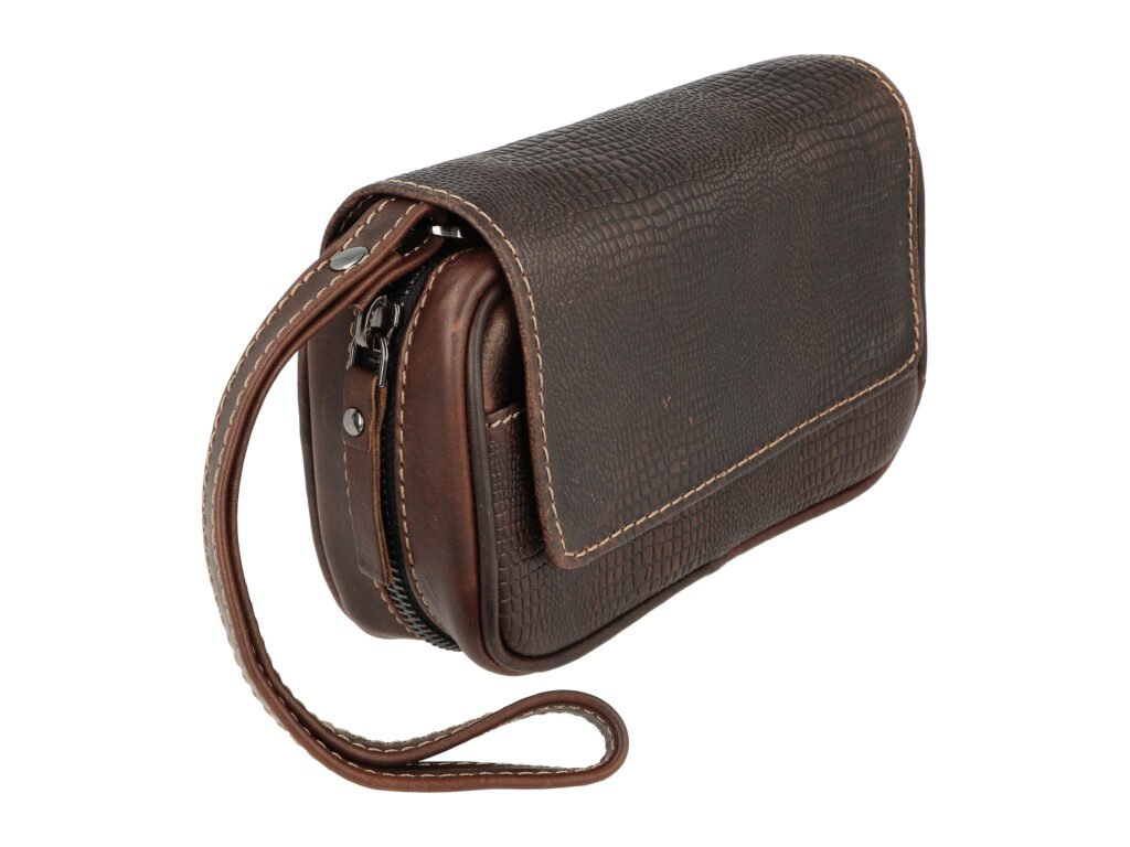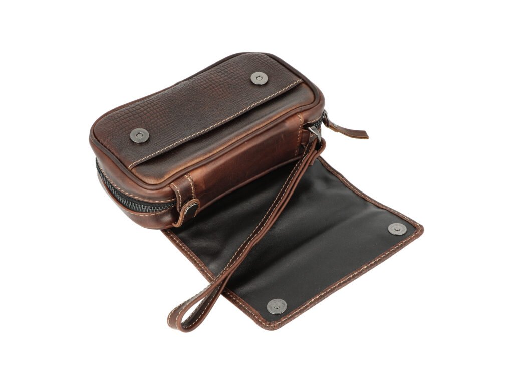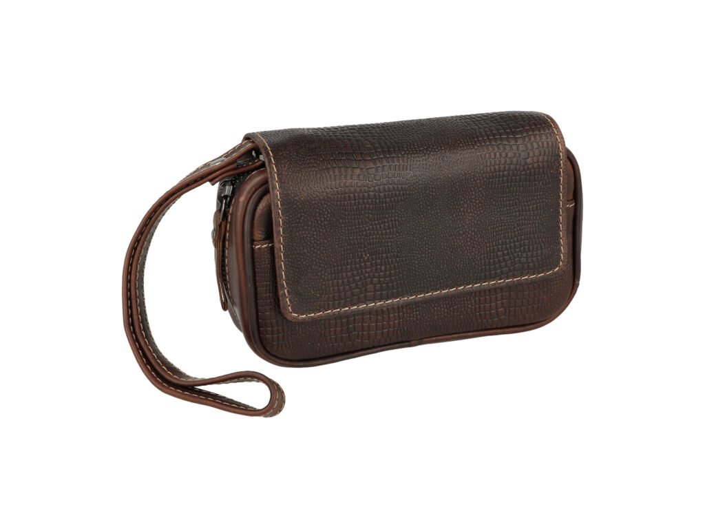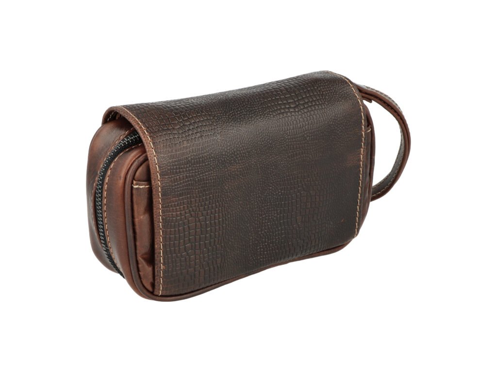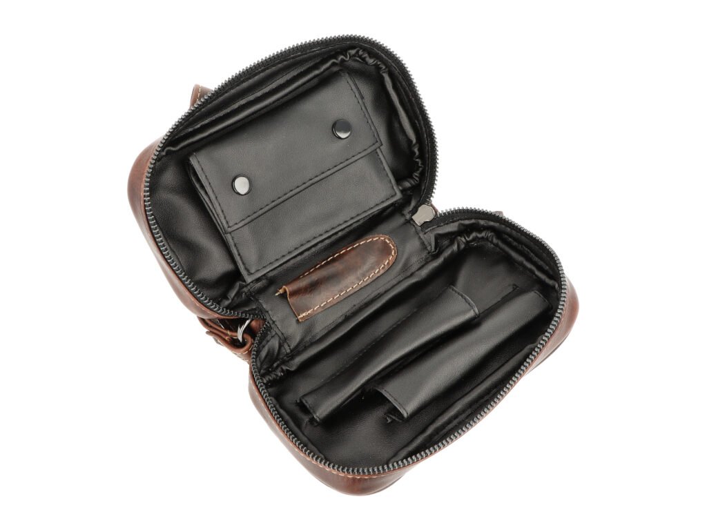 Etue - kožené pouzdro na 2 dýmky se zipem a poutkem. Precizně zpracované pouzdro na dýmky Crocco vyrobené z kvalitní kůže je ve tmavě hnědém odstínu. Kožený povrch s krokodýlím vzorem je v polomatném provedení. Po odklopení horní strany zavřené na magnet najdeme dvě kapsy např. na tabák a další potřebné dýmkové příslušenství. Po rozepnutí zipu se objeví hlavní prostor pro dvě dýmky s odepínací kapsou s patenty. Pouzdro nejen ochrání vaši oblíbenou dýmku, ale současně poskytne prostor pro vše potřebné pro kouření dýmky.