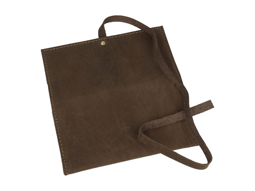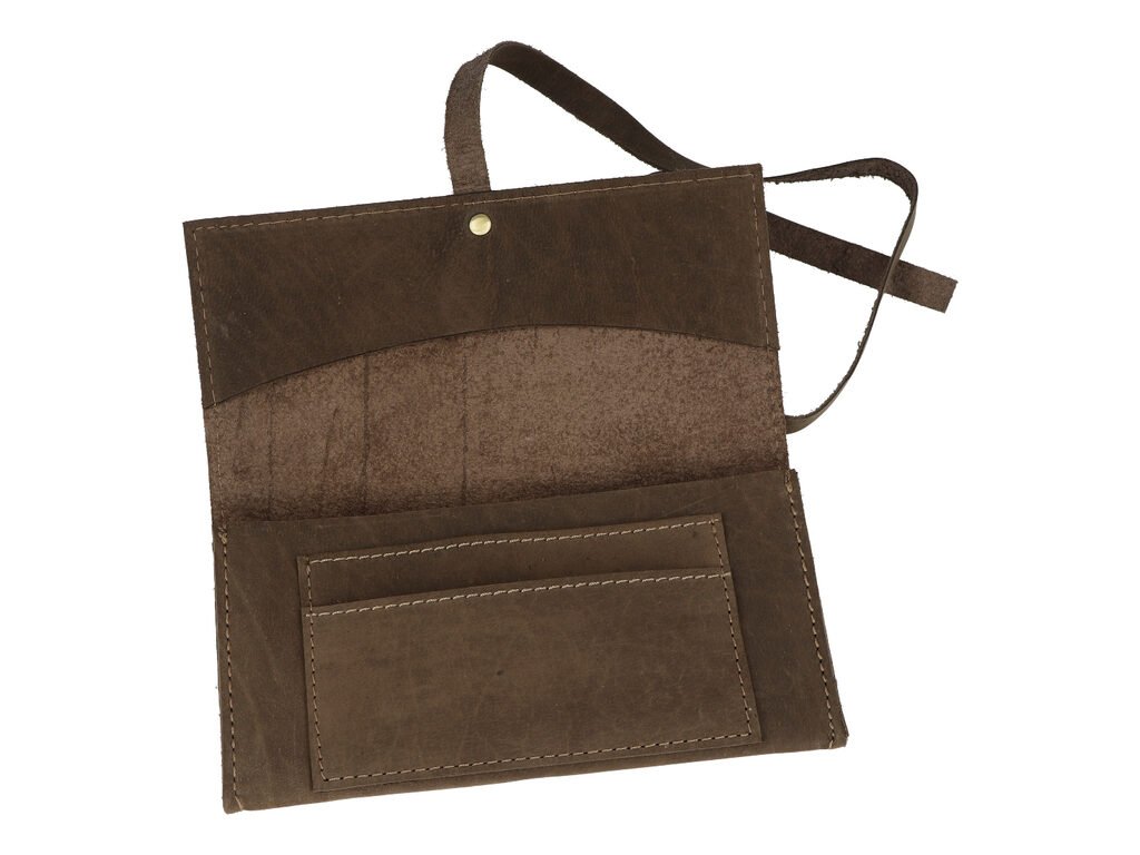 Kožené pouzdro na tabák MM. Tmavě hnědé pouzdro na tabák je vyrobené z jemně broušené kůže. Po rozevření najdeme hlavní kapsu na tabák a další tři úložné prostory pro kuřácké potřeby. Pouzdro uzavřeme přeložením a převázáním koženým páskem. Pouzdro je dodávané v papírové krabičce.