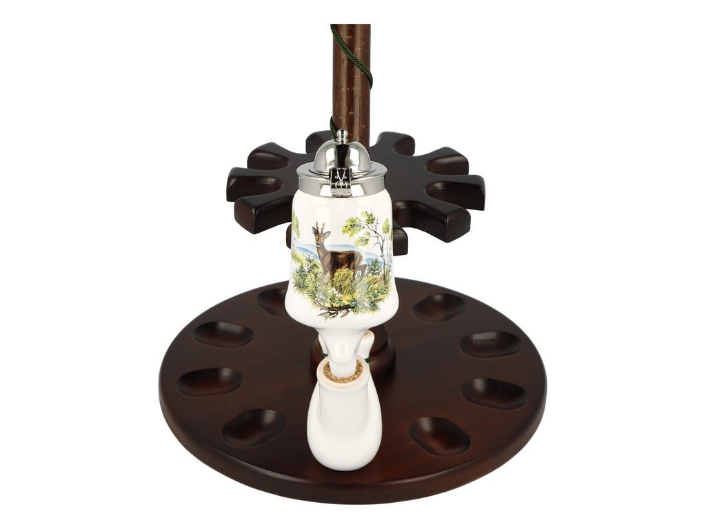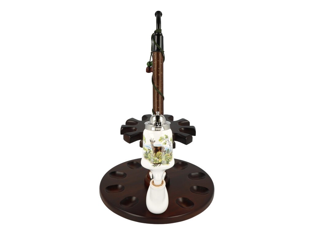 Keramická dýmka BPK Proseč. Porcelánka s loveckým motivem je ručně vyrobená. Keramická část dýmky má lesklý glazurovaný povrch. Na čelní straně hlavy dýmky najdeme barevný potisk s jelínkem. Porcelánová fajfka s dřevěným troubelem ukončená akrylátovým náustkem je zdobená omotanou šňůrkou ukončenou dřevěnými korálky. Hlavu dýmky uzavírá chromové víčko, které je zdobené jemným gravírováním. Keramická dýmka je dodávaná v dárkové krabičce. Zobrazený stojánek není součástí balení dýmky.