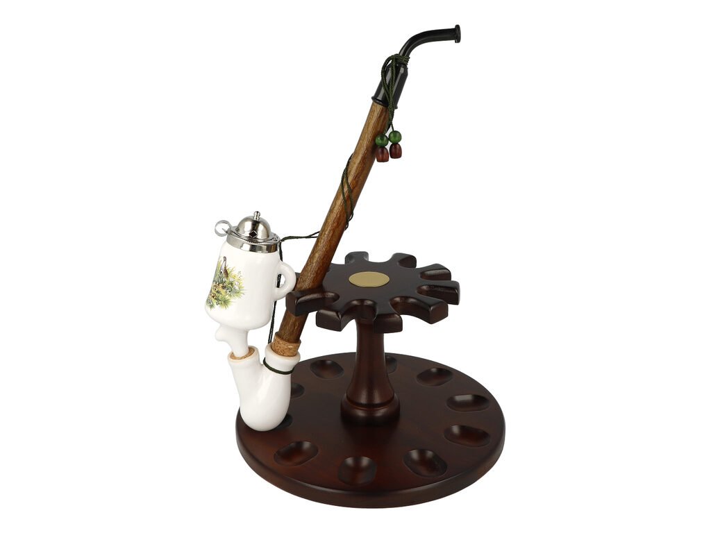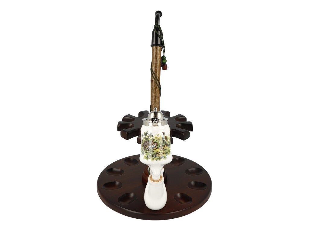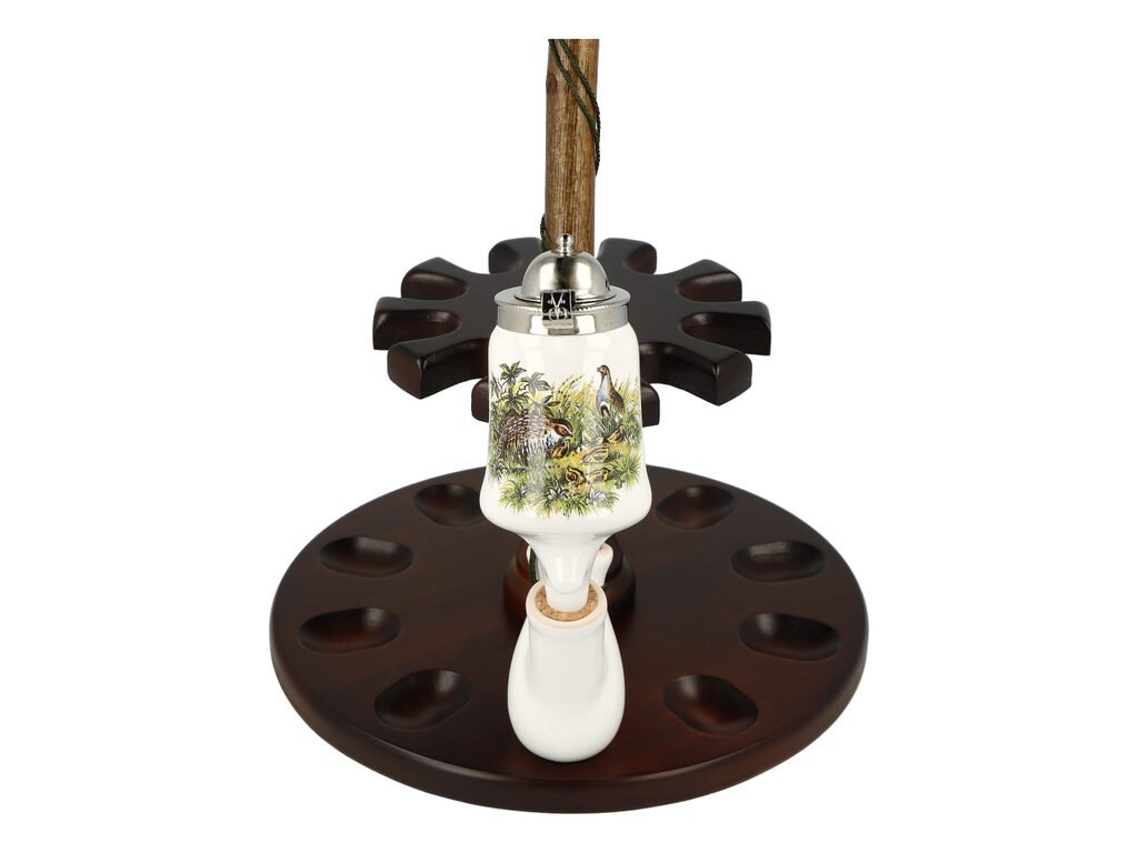 Keramická dýmka BPK Proseč. Porcelánka s loveckým motivem je ručně vyrobená. Keramická část dýmky má lesklý glazurovaný povrch. Na čelní straně hlavy dýmky najdeme barevný potisk s koroptvemi. Porcelánová fajfka s dřevěným troubelem ukončená akrylátovým náustkem je zdobená omotanou šňůrkou ukončenou dřevěnými korálky. Hlavu dýmky uzavírá chromové víčko, které je zdobené jemným gravírováním. Keramická dýmka je dodávaná v dárkové krabičce. Zobrazený stojánek není součástí balení dýmky.