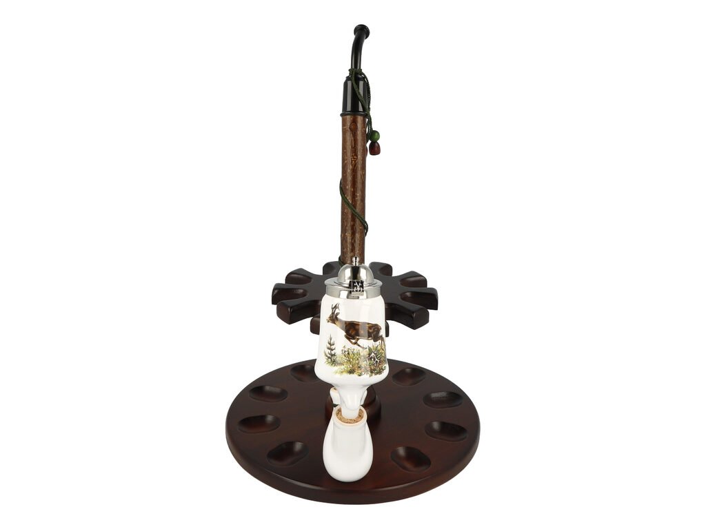 Keramická dýmka BPK Proseč. Porcelánka s loveckým motivem je ručně vyrobená. Keramická část dýmky má lesklý glazurovaný povrch. Na čelní straně hlavy dýmky najdeme barevný potisk se skákajícím jelenem. Porcelánová fajfka s dřevěným troubelem ukončená akrylátovým náustkem je zdobená omotanou šňůrkou ukončenou dřevěnými korálky. Hlavu dýmky uzavírá chromové víčko, které je zdobené jemným gravírováním. Keramická dýmka je dodávaná v dárkové krabičce. Zobrazený stojánek není součástí balení dýmky.