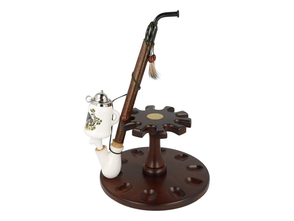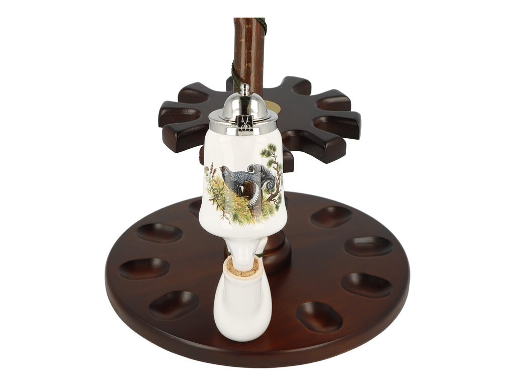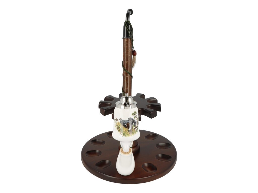 Keramická dýmka BPK Proseč. Porcelánka s loveckým motivem je ručně vyrobená. Keramická část dýmky má lesklý glazurovaný povrch. Na čelní straně hlavy dýmky najdeme barevný potisk s tetřevem. Porcelánová fajfka s dřevěným troubelem ukončená akrylátovým náustkem je zdobená omotanou šňůrkou ukončenou dřevěnými korálky. Hlavu dýmky uzavírá chromové víčko, které je zdobené jemným gravírováním. Keramická dýmka je dodávaná v dárkové krabičce. Zobrazený stojánek není součástí balení dýmky.