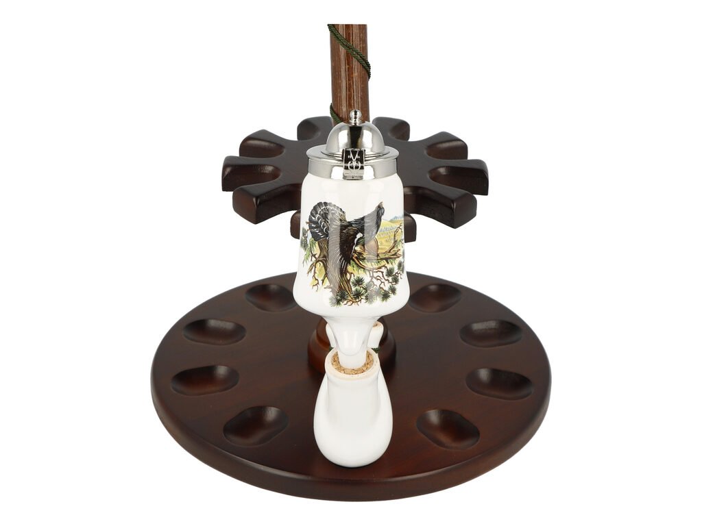 Keramická dýmka BPK Proseč. Porcelánka s loveckým motivem je ručně vyrobená. Keramická část dýmky má lesklý glazurovaný povrch. Na čelní straně hlavy dýmky najdeme barevný potisk s tetřevem. Porcelánová fajfka s dřevěným troubelem ukončená akrylátovým náustkem je zdobená omotanou šňůrkou ukončenou dřevěnými korálky. Hlavu dýmky uzavírá chromové víčko, které je zdobené jemným gravírováním. Keramická dýmka je dodávaná v dárkové krabičce. Zobrazený stojánek není součástí balení dýmky.